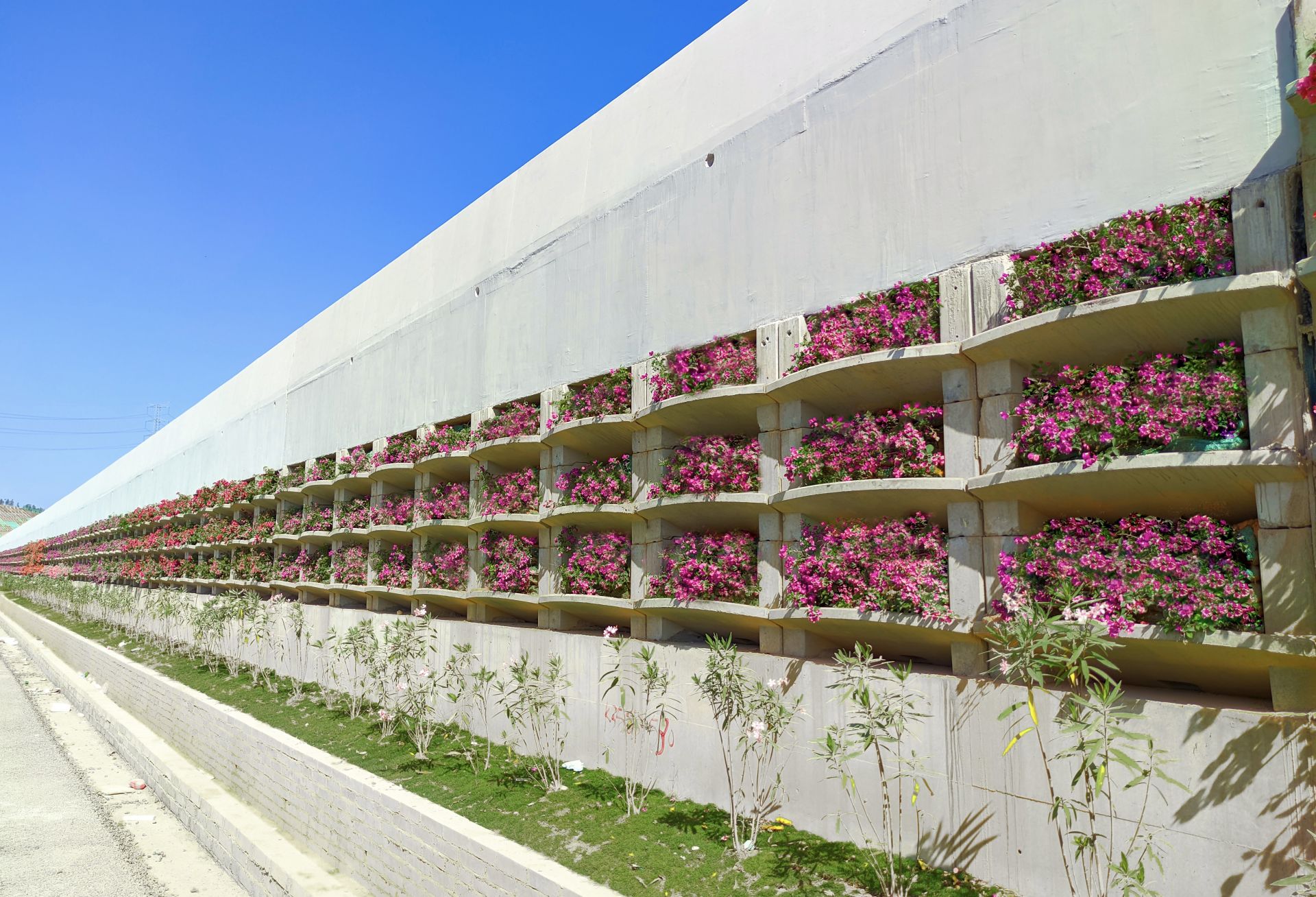 针对路堤高差,项目突破传统混凝土挡墙模式,采用宫格式空心状结构,为立体绿化创造条件。工程精选耐旱簕杜鹃,每空格栽植不少于6株,形成“花墙覆绿”的景观带,该创新工艺获全国公路微创新大赛金奖。