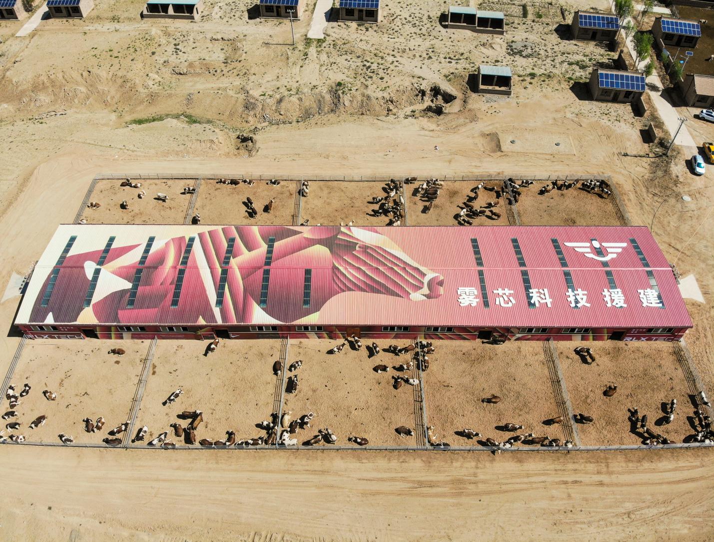 ▲宁夏吴忠市菊花台村,悦刻利用空弹新生制作的水泥,援建了一座“飞悦牛棚”。