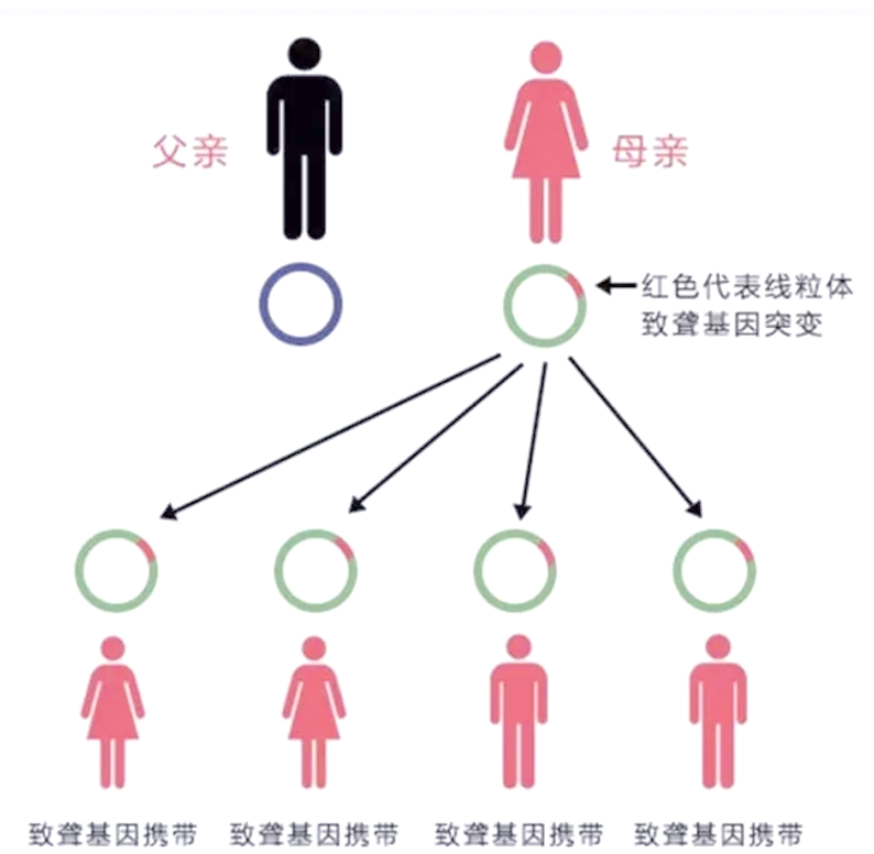线粒体12S rRNA通过线粒体遗传,这类耳聋不到1%。由线粒体DNA上的基因突变引起,通常是母系遗传,即由母亲传给子女,但只有女性会将突变传给下一代。