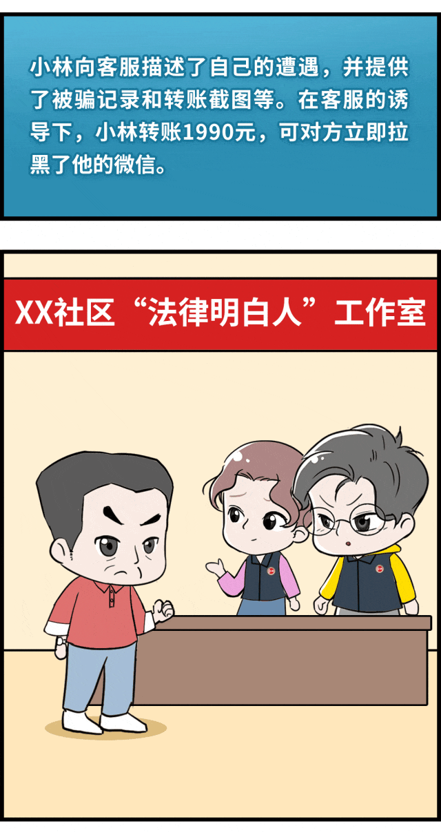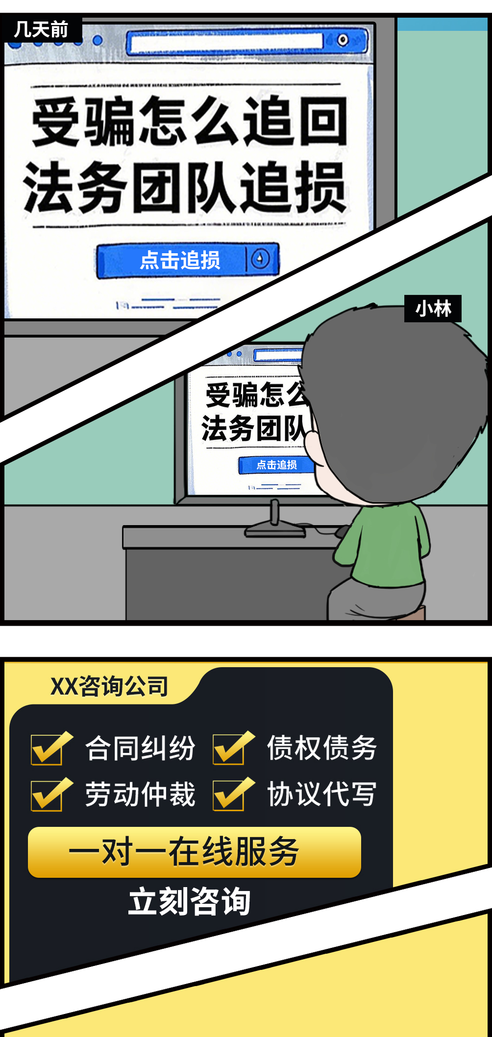 漫画案例中,小林经历“投资诈骗”后没有第一时间报警,反而为了挽回损失,盲目在网上搜索“维权追损”,最终因“病急乱投医”的心理被诈骗团伙利用,落入陷阱。