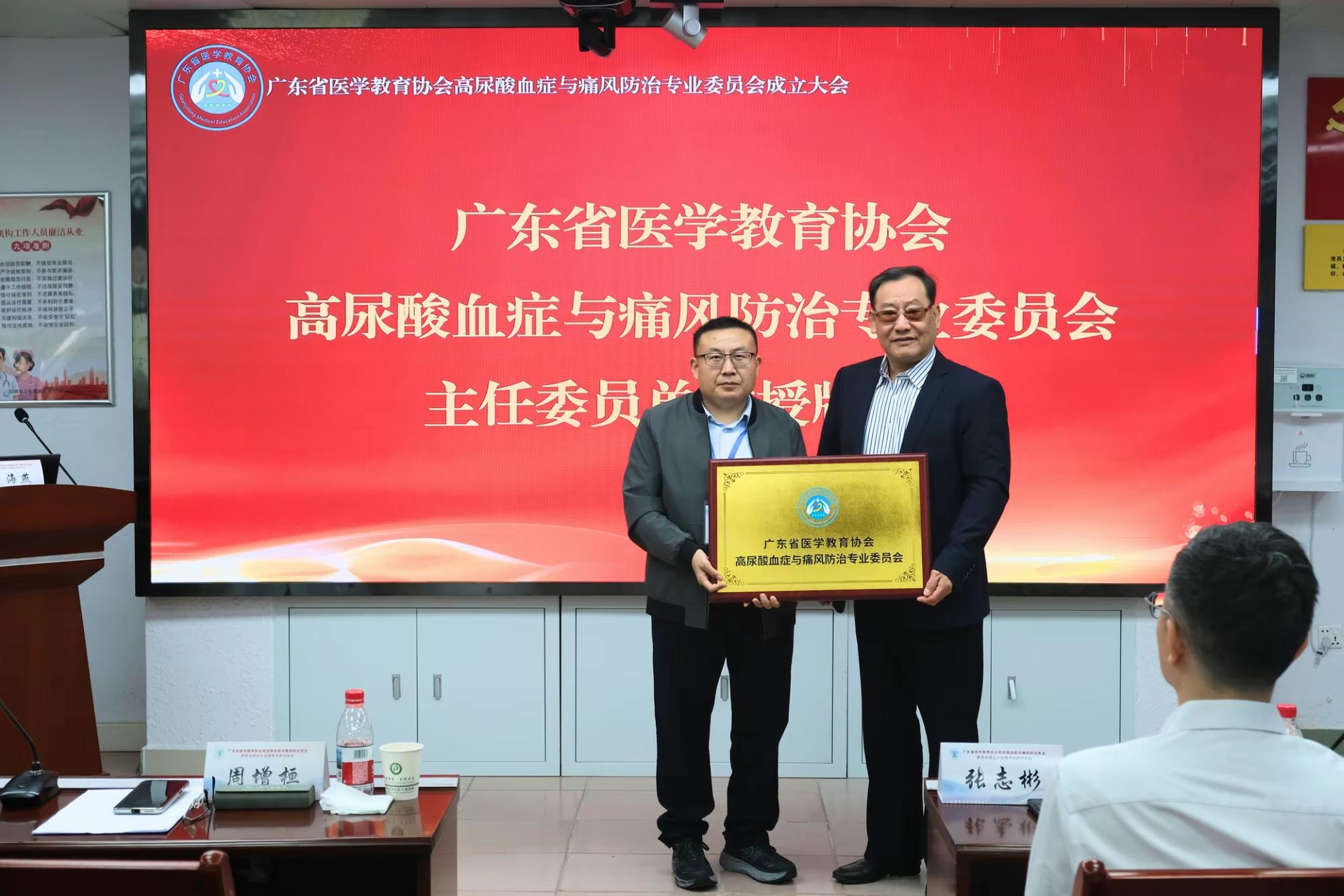 專委會成立大會上,廣東省醫學教育協會醫學教育專家委員會主席周增桓教授代表協會授予專委會牌匾,並發表了熱情洋溢的致辭,強調了在慢性病發病率持續攀升的背景下,加強高尿酸血症與痛風防治能力建設的重要性和緊迫性。