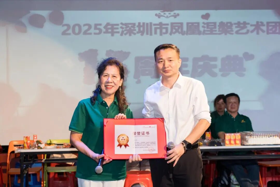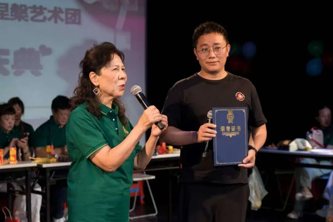 活动现场,郭丽英为阳海军、龙际恩颁发荣誉证书。她表示,“外婆关爱基金从2019年起便一路陪伴、支持我们,为团员们筹备多次集体生日会。团员们告诉我,希望能有机会登上外婆关爱基金开展的活动舞台上,用自己的演绎回馈这份长久以来的关爱。”