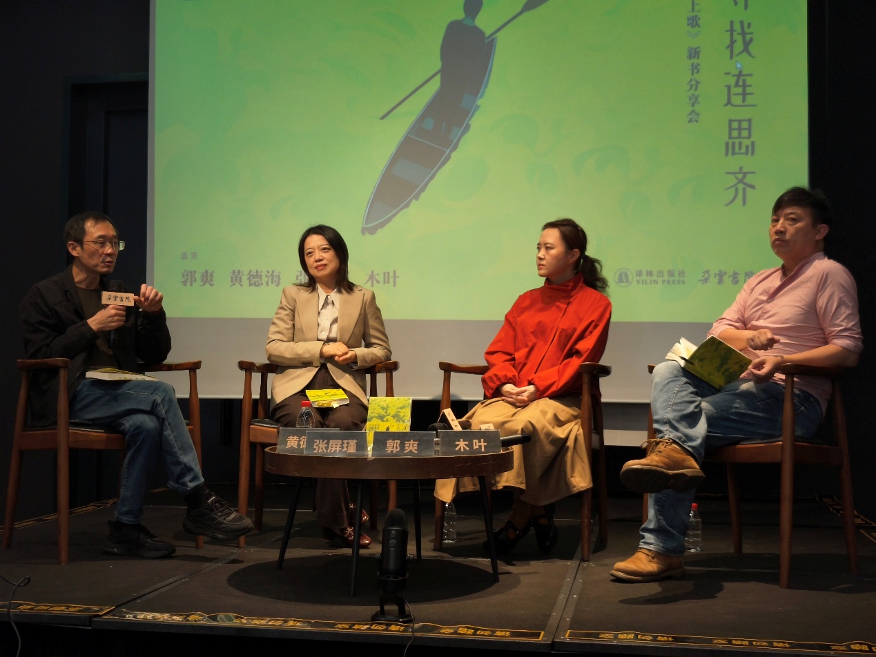 11月16日下午,由译林出版社主办的“寻找连思齐——《河上歌》新书分享会”在上海黄浦江边的朵云书院·旗舰店举行。80后实力派作家郭爽携首部长篇小说《河上歌》,与文学评论家黄德海、同济大学人文学院教授张屏瑾、诗人木叶展开了一场关于天才、自我与时代精神的深度对谈。译林出版社副总编辑陈叶出席本次活动。