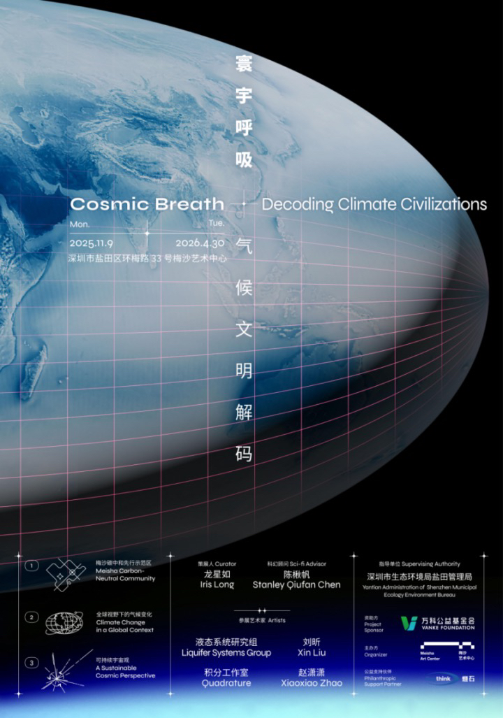 据悉,此次展览作为“山海共生季”系列活动,位于梅沙艺术中心B1层展厅,将持续至2026年4月30日,展览约200平方米的展陈空间融合数据可视化、沉浸互动与艺术装置,将抽象的气候科学转化为可感知的体验。展览从深圳本地气候故事出发,延伸至全球气候脉动,最终抵达宇宙维度的思考,旨在唤醒公众对气候变化的认识与行动。
