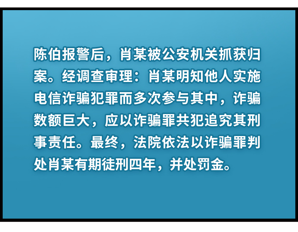 近年来,针对老年人群体的诈骗犯罪案件屡见不鲜,犯罪分子利用部分老年人信息接收不及时、防骗意识较薄弱等特点,编造“子女涉案”“急需用钱”等谎言实施诈骗。上述案例中,受害人陈伯在遭遇诈骗时,幸得“法律明白人”阿鹏、小布路过察觉异常,及时提醒其报警求助。公安机关将负责“跑腿”的肖某抓获,查实肖某明知他人实施诈骗,仍多次协助诈骗分子取款。最终,法院依法以诈骗罪判处肖某有期徒刑四年,并处罚金。责令肖某退赔各被害人损失。