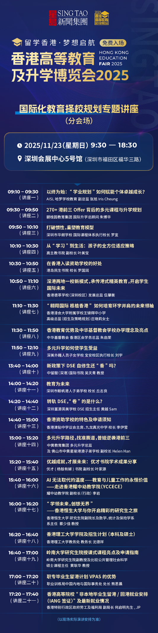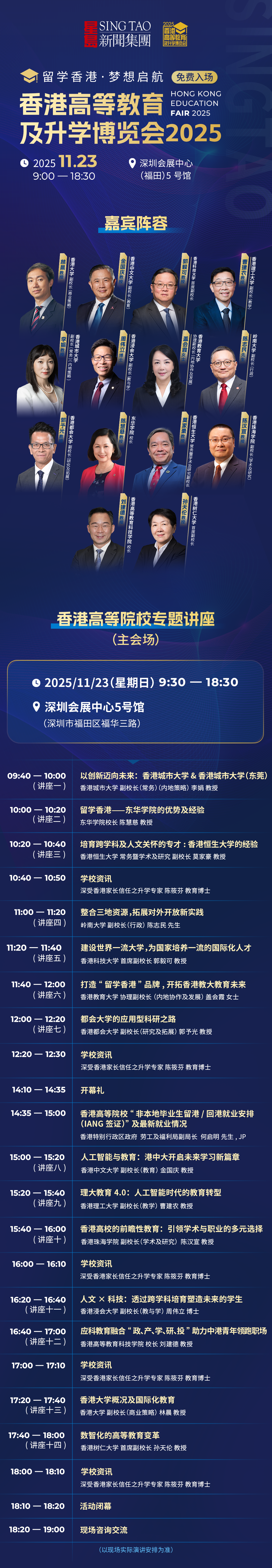 由香港特區政府教育局、深圳市教育局權威支持,星島新聞集團主辦的香港高等教育及升學博覽會2025將於11月23日在深圳福田會展中心(5號館)舉行。據悉,含“港八大”在內的18所香港高等院校、30所香港名優中小學,以及20所大灣區國際學校及教育機構將齊聚一堂,15所香港高校校長親臨現場,面對面暢談香港高校特色,分享赴港升學一手資訊。從小學到碩士全學段資源,一站式破解升學難題,直擊大灣區家庭的核心需求。展會全天舉行,全程免費入場。