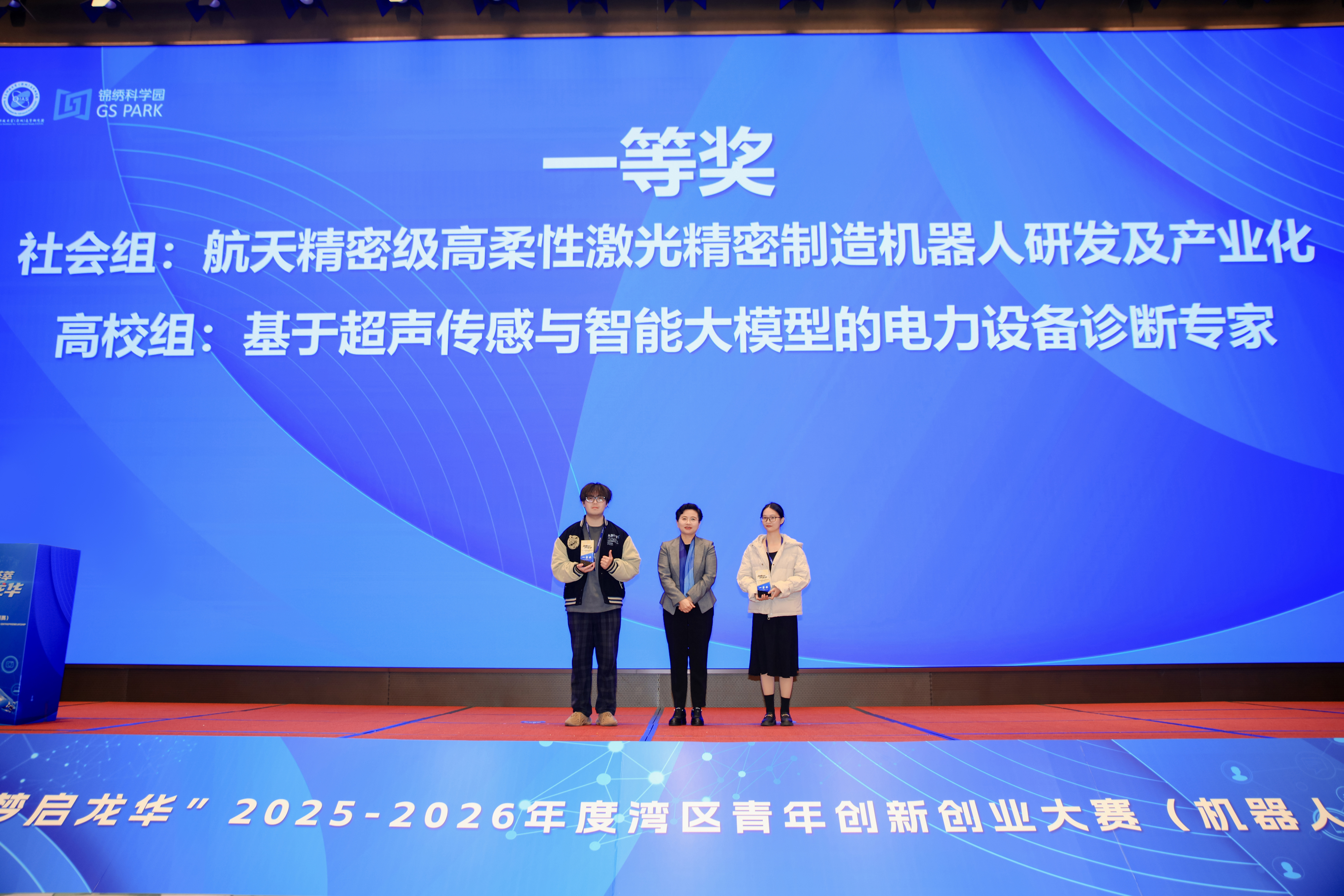 大赛以机器人为主题,设置社会组、高校组两个参赛组别,覆盖不同创新主体。自9月26日启动以来,大赛受到社会各界广泛关注,吸引了众多湾区青年创业者积极参与。经过初赛选拔,来自社会组、高校组的各八强项目在决赛中通过项目展示、现场答辩等环节,充分展现当代青年瞄准科技前沿、聚焦市场需求的创新能力和创业活力。经过激烈角逐,社会组项目《航天精密级高柔性激光精密制造机器人研发及产业化》与高校组项目《基于超声传感与智能大模型的电力设备诊断专家》最终脱颖而出,分别荣获一等奖。颁奖仪式上,现场领导为获奖团队颁发奖杯和证书,勉励青年创业者持续深耕机器人领域,将创新理念转化为实干成果,在龙华这片创新热土上实现创业梦想。