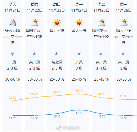 记者从深圳市气象台了解到,20日强冷空气对我市的影响已减弱,全市日平均气温普遍在14-15℃,较前一日上升2℃左右。预计未来几天阳光逐渐回归,气温回升。具体来说: