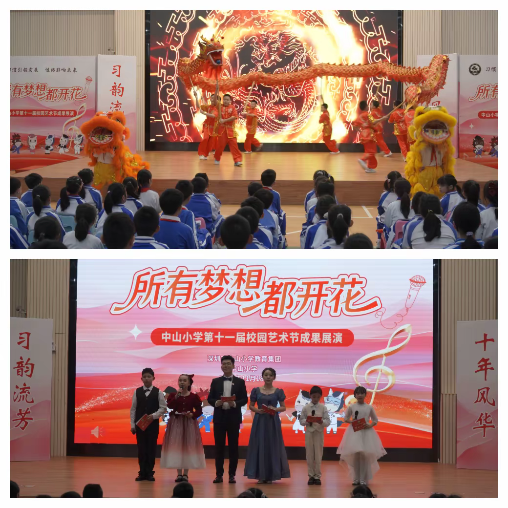 下午,“所有梦想都开花——第十一届校园艺术节文艺汇演”在中山小学习体馆上演。京剧《梨园童韵》展现国粹传承活力,舞蹈《小荷尖角》诠释“坚毅进取”校训,《劳动是华夏儿女永远追寻的歌》传递劳动育人理念,合唱团《风》与啦啦操《活力啦“啦”满》轮番点燃现场。活动中,中山小学教育集团与深圳技术大学共建基地揭牌,标志着习性教育校际合作迈出新步,深圳技术大学蔡沐辰老师演唱《红日》注入青春能量。
