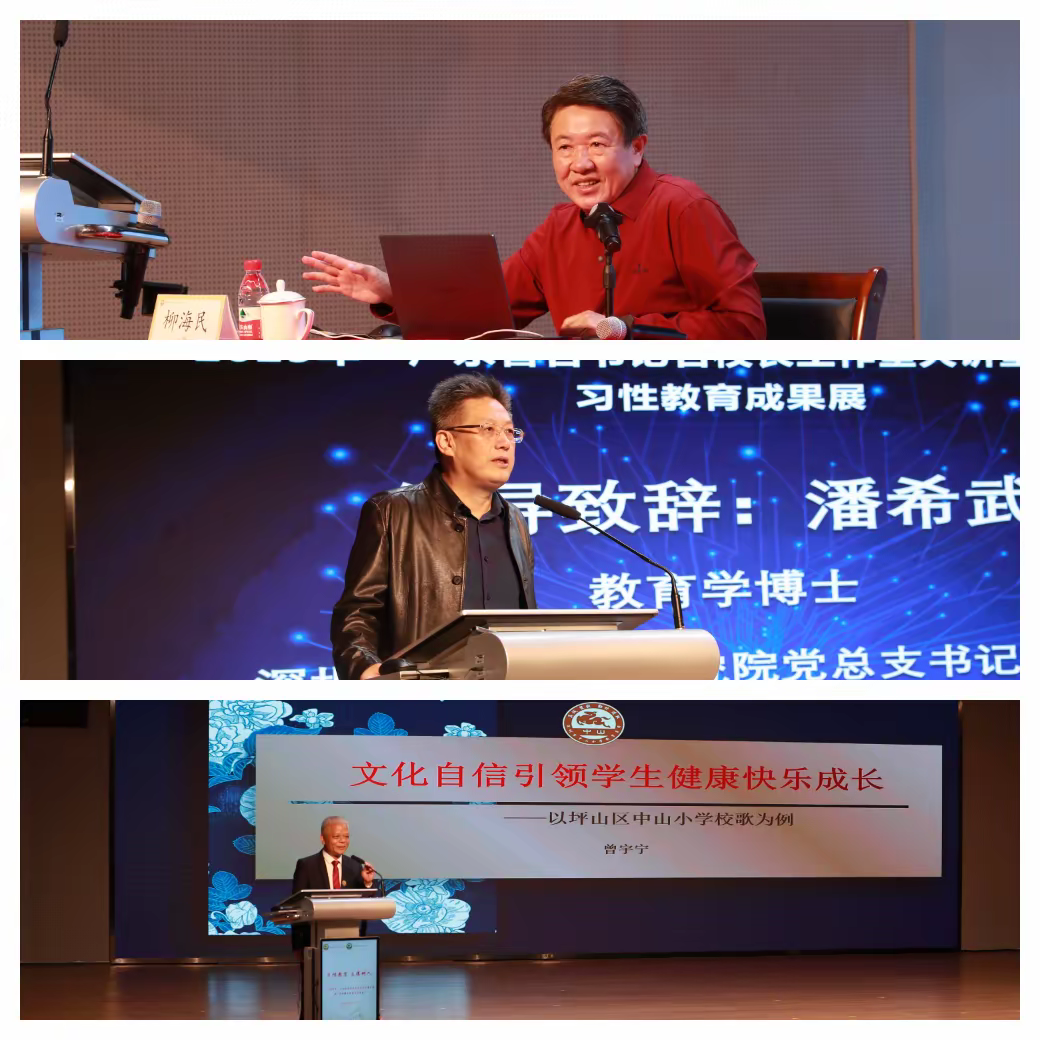 升旗仪式后,广东省名书记名校长工作室大讲堂活动暨习性教育成果展在集团成员校日新小学举行。东北师范大学柳海民教授、深圳市教科院潘希武院长等专家,围绕AI课改、文化品牌等展开交流。曾宇宁校长以校歌为引,阐释“文化自信引领学生健康成长”的实践智慧。