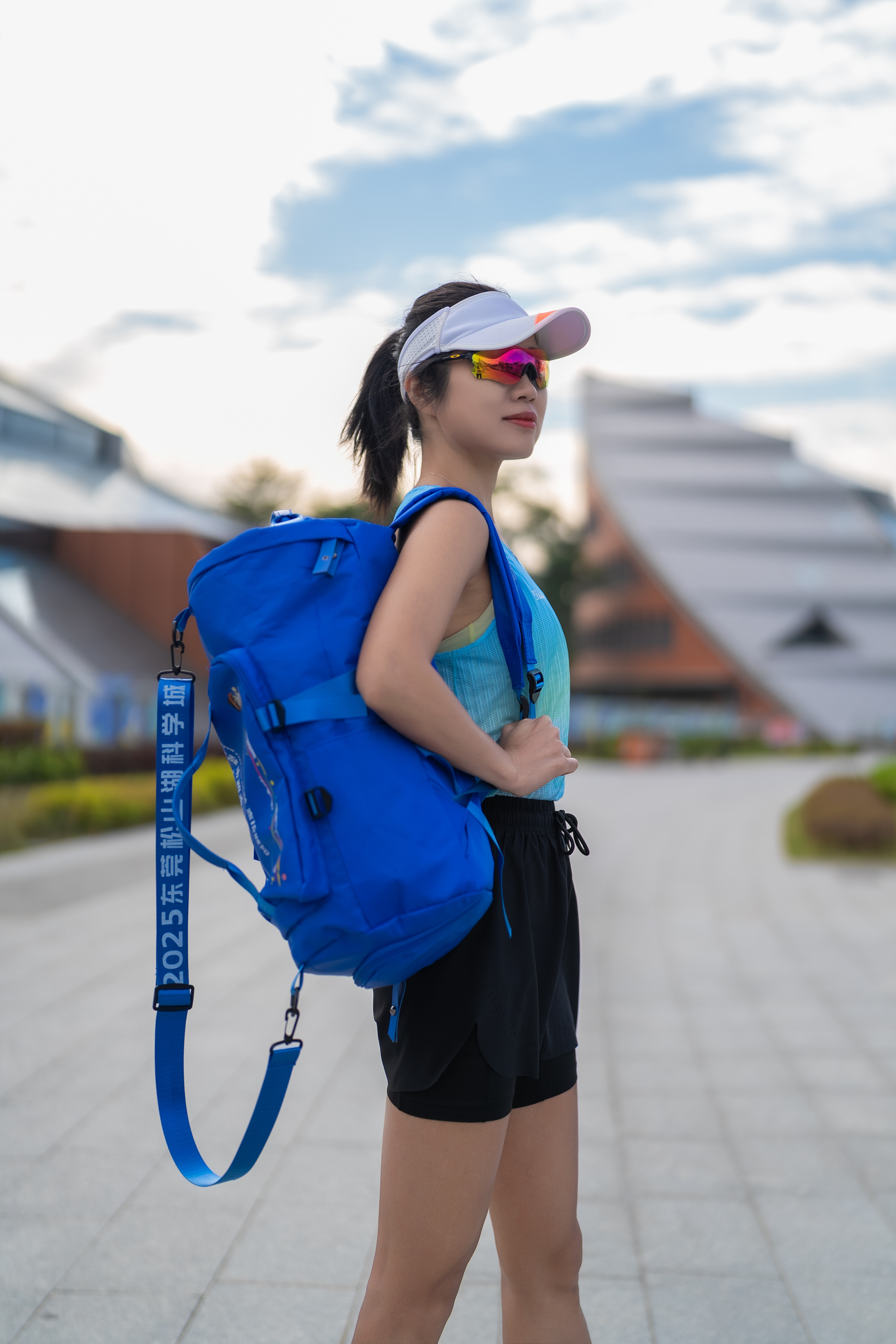 参赛包的色调采用蓝色为主色调,材质轻便,环保耐用,满足大容量需求,背包设计方便选手个人物品的放取以及携带。