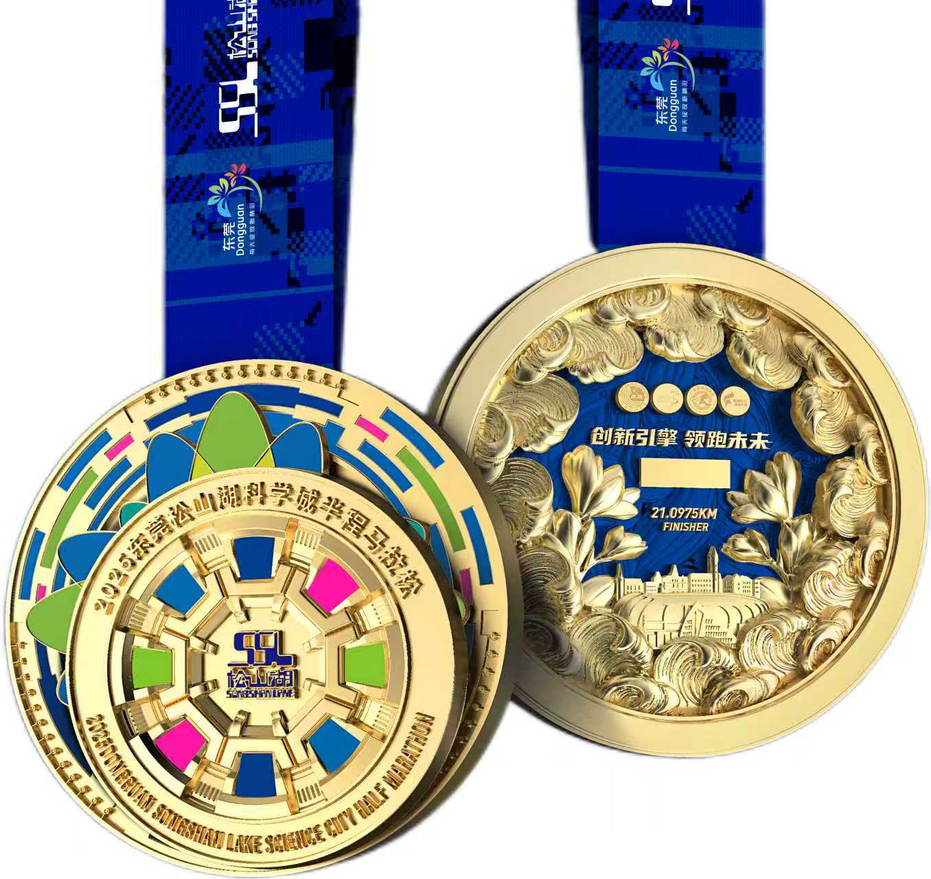完赛奖牌正面通过双层环结构诠释科技内核:彩色大环以灵动缤纷科技线条,具象化松山湖蓬勃的创新生态与发展活力。双环间可旋转的中国散裂中子源部件元素致敬这一“国之重器”,也象征科学探索与运动精神的动态共生。奖牌用手机碰一碰还可呈现松山湖宣传视频。