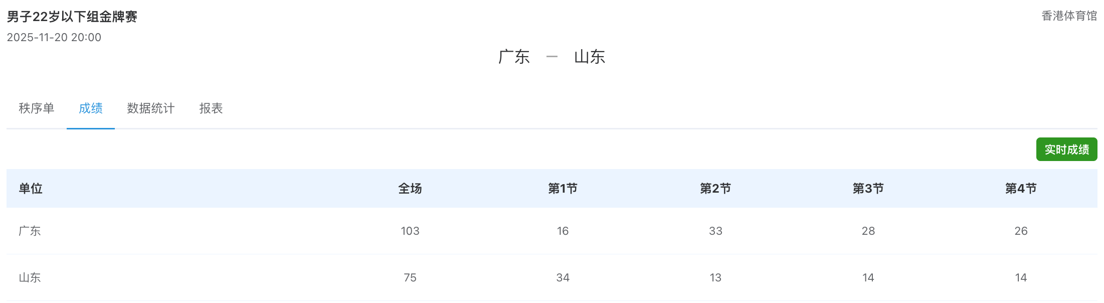 11月20日,第十五届全运会篮球男子22岁以下金牌赛在香港体育馆打响。广东U22男篮以103比75击败山东队,站上最高领奖台!至此,十五运五人制男子篮球项目成年组、U22、U18共3枚金牌归属全部决出,广东队完成包揽。
