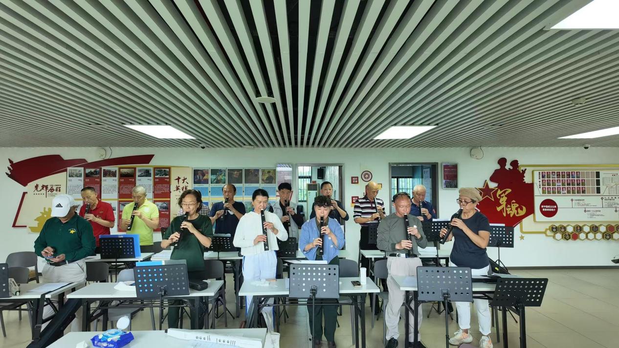 值得一提的是,活动在传统合唱之外加入了电吹管教学与演奏,为退役军人带来全新体验。专业老师从按键指法、气息控制到演奏节奏进行细致讲解。“练气息就像当年练队列,要稳!”一句轻松的比喻让老兵们会心大笑,课堂氛围轻松而热烈。随后的练习环节中,老兵们反复调试、认真练习,当《我和我的祖国》的旋律在电吹管中悠扬奏出时,现场再次被感动与自豪包围。