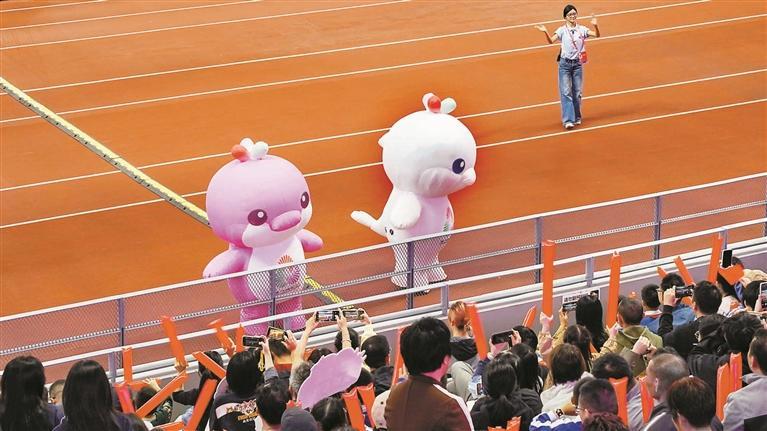 宝安体育场内,吉祥物喜洋洋与乐融融在足球赛前与观众互动。