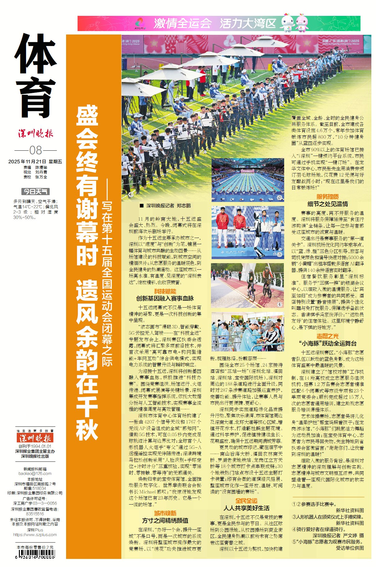 1、十五运会闭幕式将于今晚在欢乐剧场举行。以海天为幕,以城市为景,在全运会历史上第一次把闭幕式搬到滨海实景舞台,进行陆域看台与水域舞台的创新融合设计。另外,为确保闭幕式期间道路交通安全、有序、畅通,深圳交警将对部分道路采取临时管制。详情>>