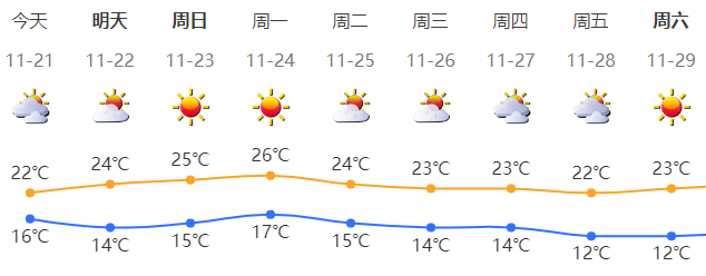 【今日天气】多云到晴天,空气干燥;气温16-22℃;偏北风2-3级;相对湿度30%-50%。