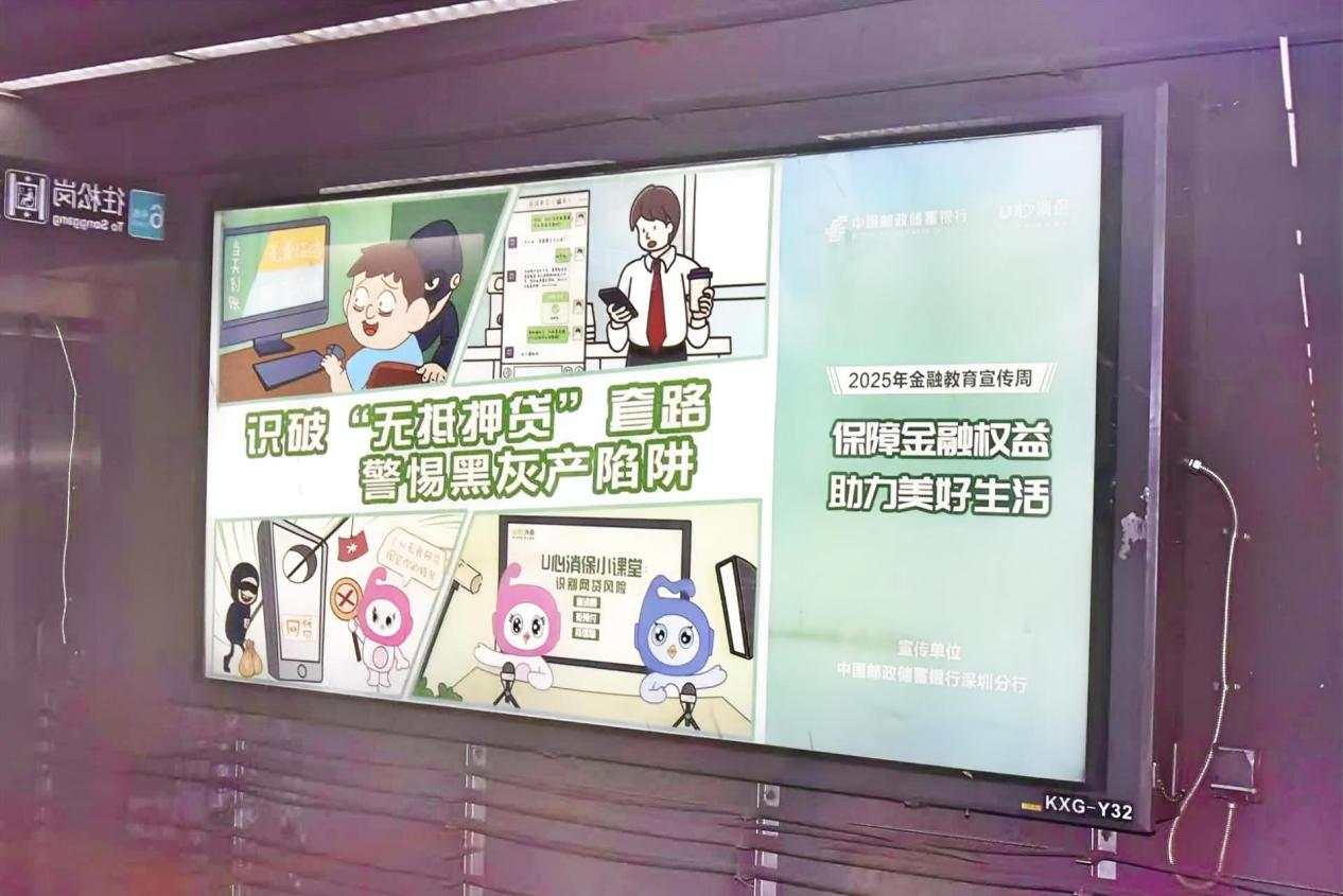 为避免标识孤立展示,邮储银行深圳分行将“U心消保”与消费者日常场景、地域文化及需求痛点深度绑定,让金融教育更可感知、易接受。在日常消费场景中,该行在深圳地铁1号和9号线打造灯箱宣传,将标识与“识破‘无抵押贷’套路,警惕黑灰产陷阱”等实用内容结合,让通勤人群在乘车过程中轻松学习金融知识。