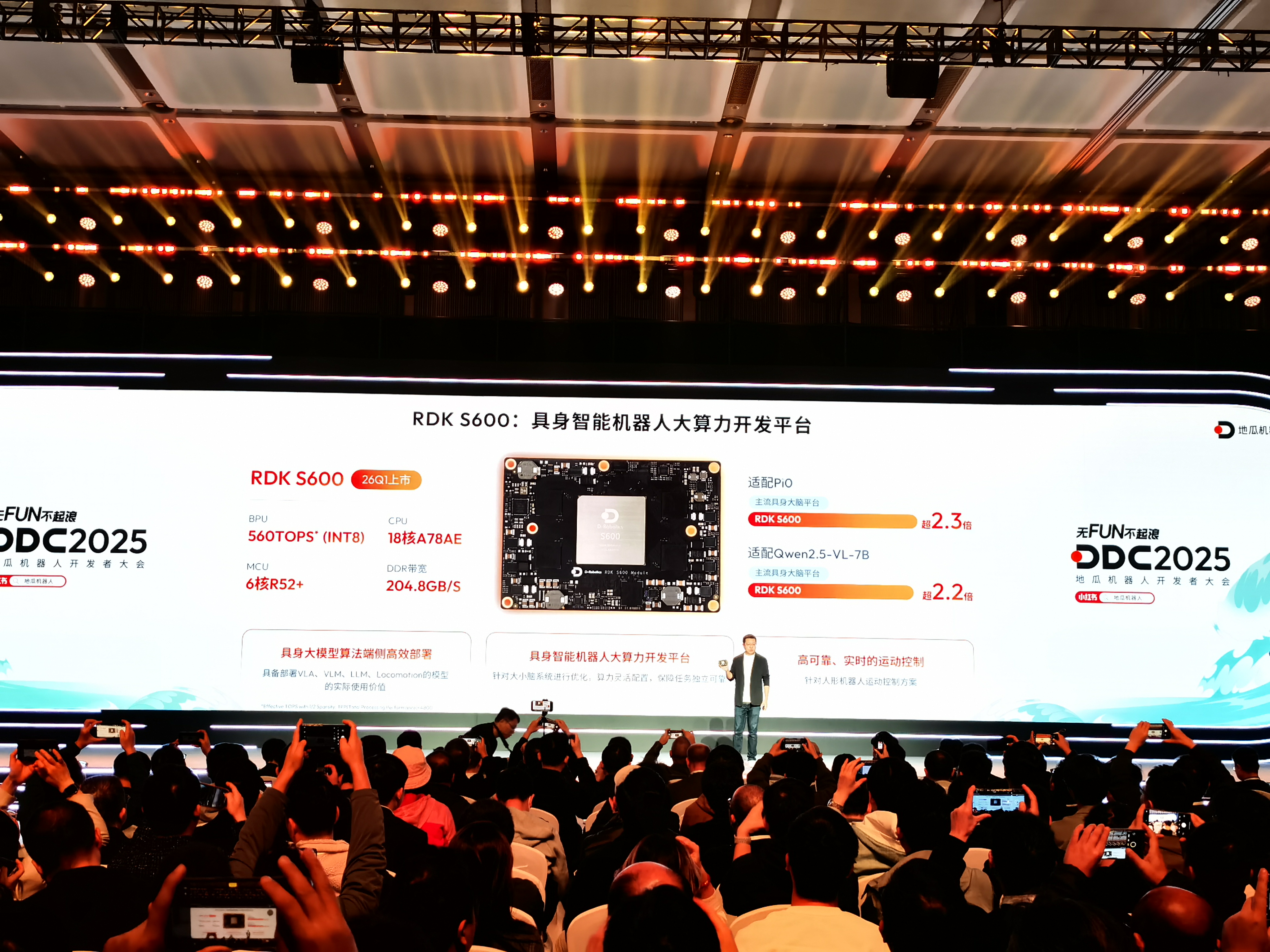 活动现场发布了多款技术新品,其中,地瓜机器人发布560TOPS算力的具身智能芯片S600,致力于打造新一代国产具身智能核心平台,赋能具身机器人的高效研发和规模落地。