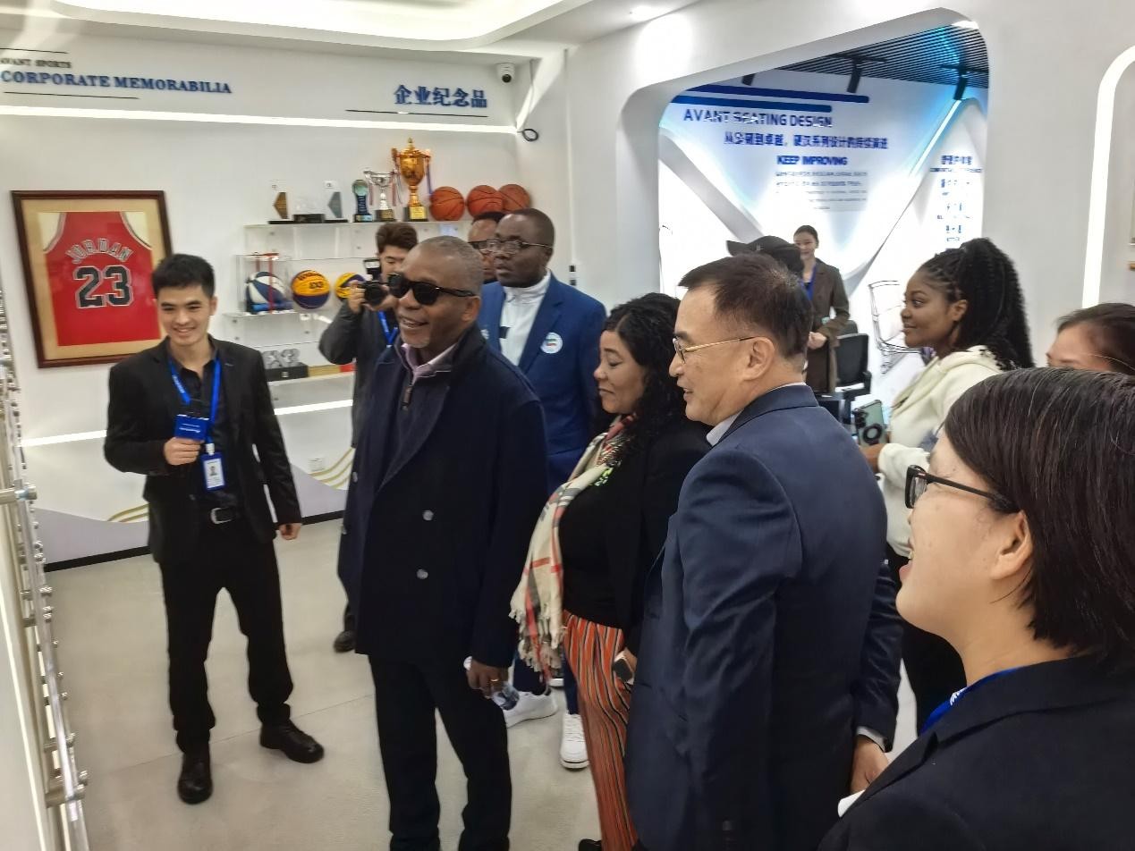 闭幕式当日,赤道几内亚奥委会主席埃武纳率代表团一行6人来到领先体育深圳总部参观访问,走访了领先体育办公区、企业展厅及云场馆。现场展示的伸缩活动看台、智能控制平台、运动木地板、多类型篮球架及多功能舞台设备等产品,引发嘉宾浓厚兴趣。