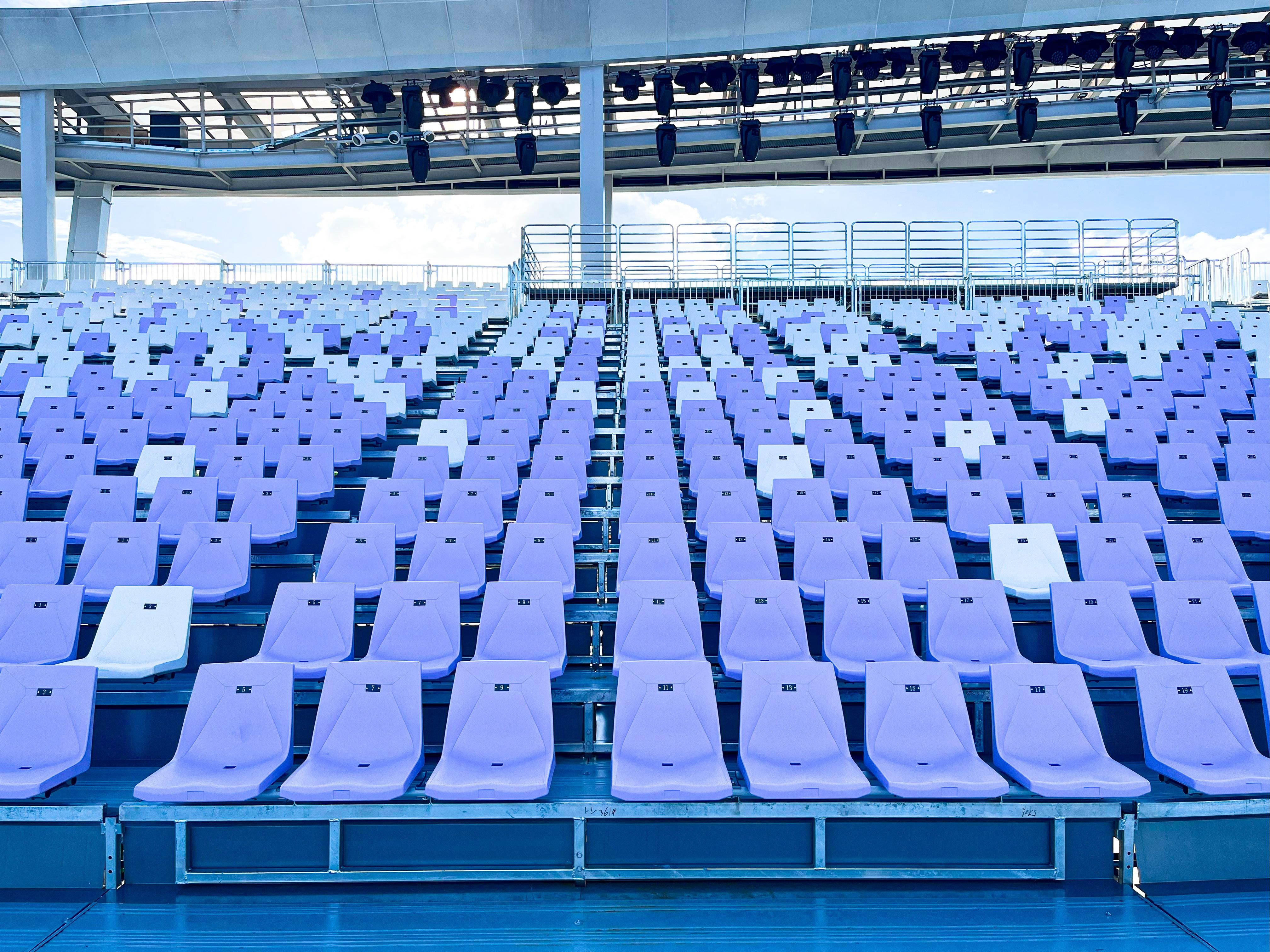 闭幕式采用的金属看台系统为领先体育安易拆装式金属看台,该产品采用模块化预制设计,可实现现场快速组装与拆卸,并适应欢乐港湾剧场独特的海滨地形和周边景观布局进行灵活定制,最大程度满足音乐演出与城市景观融合的需求。其模块化扩展设计,可便捷地增加座位数量,为剧场未来承接不同规模与类型的演出预留了充分的调节空间。系统适配多种地形条件,同时具备高强度结构安全性,确保整体使用的稳固可靠。