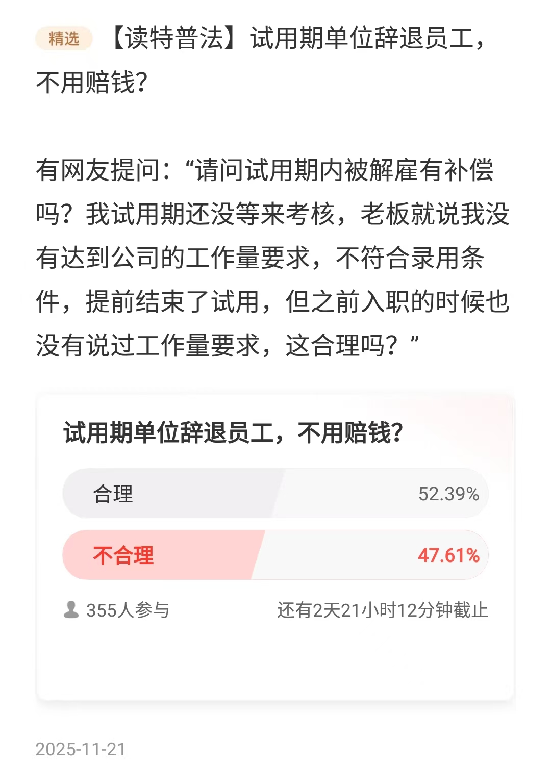 为调查大众对该问题的认知现状,读特新闻记者在鹏友圈发起投票,结果显示52.39%的参与者认为 “试用期内公司可随意辞退员工,且无需支付经济补偿” 合理,但事实并非如此。