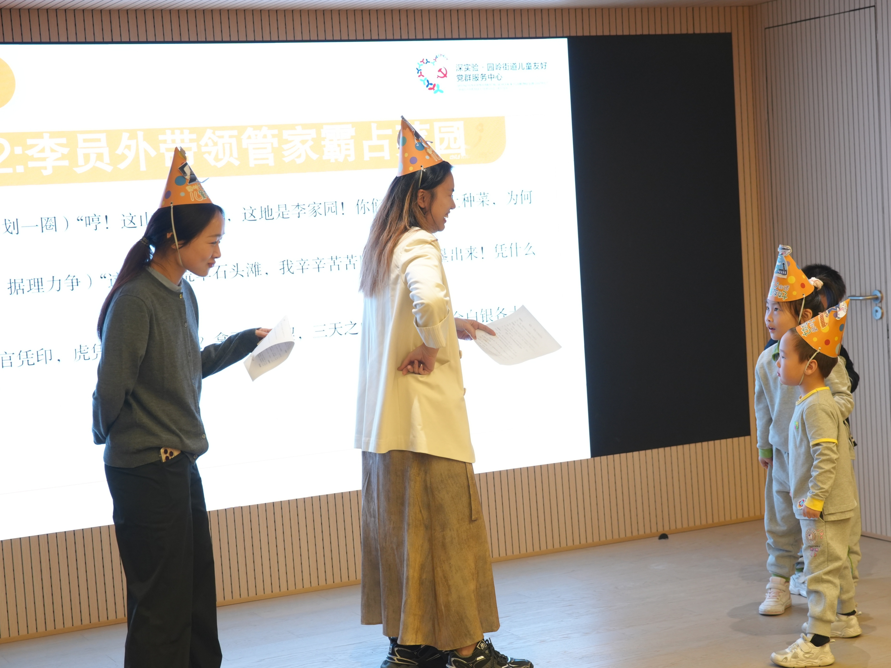 情景剧场环节将活动推向高潮。一位妈妈叉腰扮演“李员外”,在试图霸占菜园时,孩子们挺起小胸脯异口同声反驳:“我们有劳动证据,你没有!”稚嫩而坚定的表现赢得全场掌声,“贪婪致恶、勤劳成福”的道理在欢笑声中深深印入童心。
