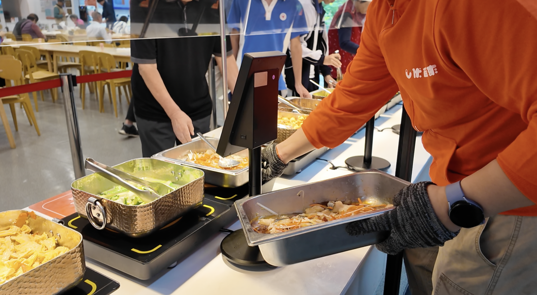 走进食堂,科技感与人性化设计融为一体,餐台每15分钟轮换菜品,保温餐柜恒温75℃,确保冬日用餐全程温暖。