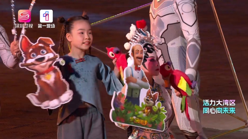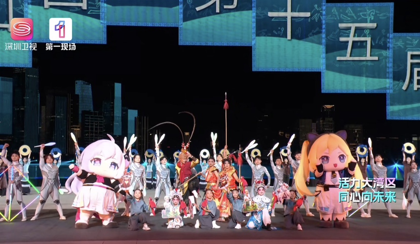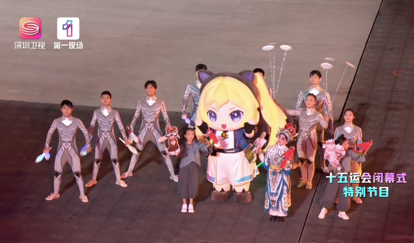 闭幕式舞台上,《卡拉彼丘》人气角色米雪儿、香奈美人偶惊喜登场,与深圳市宝安区蚝业小学粤剧队、深圳坪山小麒麟少儿艺术团的舞蹈表演梦幻联动,带来暖场表演《缤纷多次元》,共同为国家级体育盛事注入鲜活文化活力。小演员们以饱满热情演绎粤韵风华,手中挥舞的创梦天地旗下《梦幻花园》IP 角色手持牌,为古典韵味巧添潮流感,妥妥成为深圳文化传承创新的 “小小代言人”。活力满格的米雪儿、香奈美人偶与少儿非遗团俏皮互动,瞬间打破传统与现代的次元壁。米雪儿以热爱挑战的超级玩家人设呼应全运会体育精神,香奈美作为偶像歌姬,其主题曲《你看 世界好美》更斩获国家级游戏音乐大奖,更让二次元活力与非遗艺术碰撞出炽热火花,让古老文化在青春表达中焕发蓬勃生机。