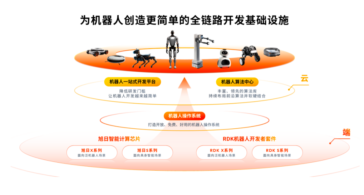 面向端侧,基于成熟且不断进化的BPU智能计算架构,打造覆盖各算力段的旭日和RDK双系列产品矩阵并稳步迭代。面向云侧,打造让机器人开发更简单的一站式开发平台,结合数百种不断更新的端侧可直接部署的机器人智能算法,助力客户和开发者高效打造具有竞争力的智能机器人产品。