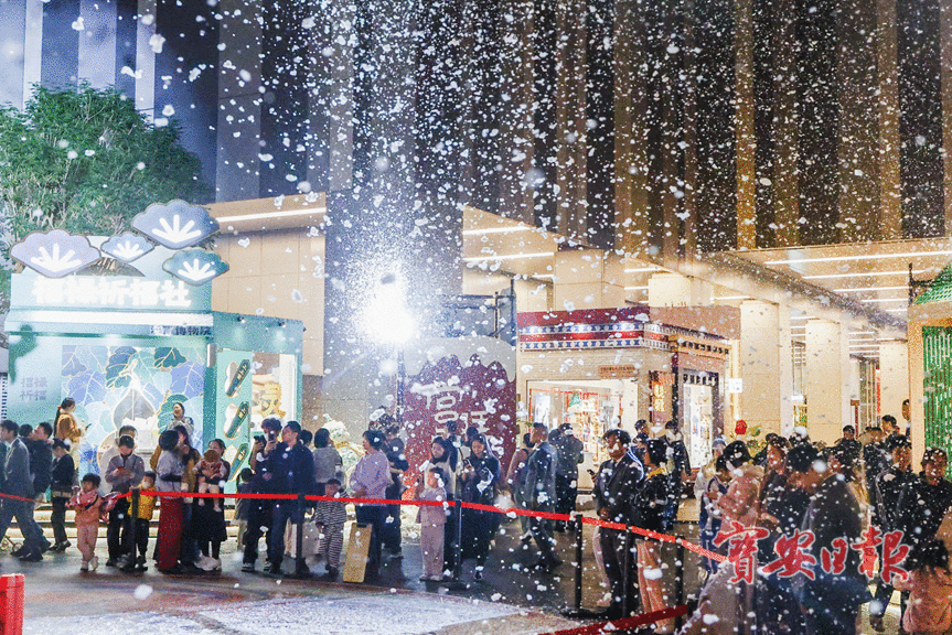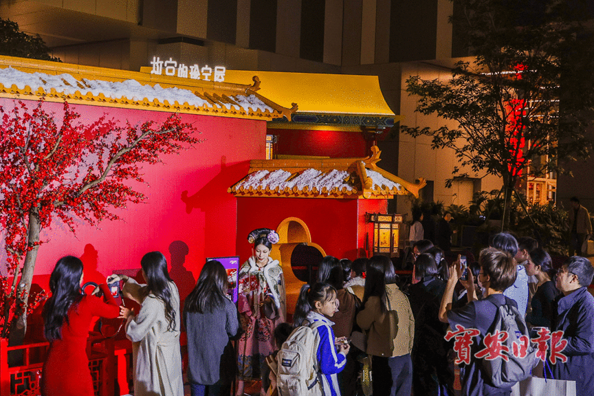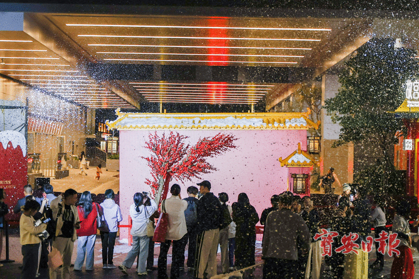 本次活动的核心是在商场内复刻一个极具东方美学的“倚梅园”。场景设计汲取自故宫的红墙白雪与古典园林的造景精髓,通过“红墙堆雪”、“红梅垂枝”等标志性元素,将小说与影视剧中描绘的踏雪寻梅意境变为现实。漫天的人造飞雪定时降临,为整个空间披上银装,打造一场唯美的“宫廷飘雪秀”,让身处岭南的市民无需远行,即可尽情打卡拍照。活动将持续至12月7日,每周六、周日将在LG层星光道“亮相”。