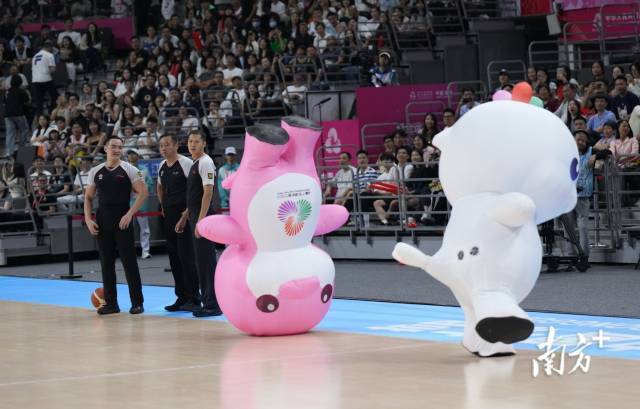 十五运会男篮成年组现场,吉祥物“喜洋洋”“乐融融”表演倒立“绝活”。龚名扬 摄