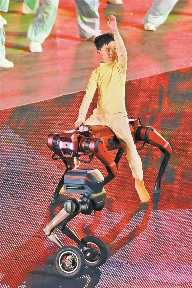 11月21日晚,十五运会闭幕式舞台上,4台通体火红的“火狗智能赤犬Ⅲ号”机器狗迈着稳健步伐,载着小朋友登台,成为十五运会闭幕式的亮眼风景。这场“城市全景闭幕式”上,来自宝安的火狗智能科技,用一个月的紧急攻关,让工业级机器狗成功转型舞台“演员”。