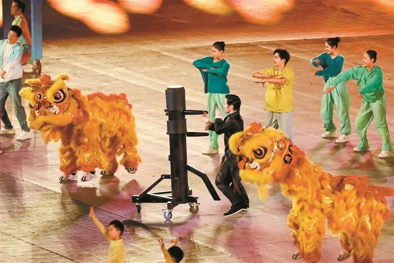 闭幕式更将这份“联结”搬上舞台。三辆酷炫的新能源汽车载着深圳运动员代表王欣瑜、香港运动员代表李思颖与澳门运动员代表郭建恒驶上舞台,三人并肩挥手的瞬间,正是“湾区一家亲”的最佳写照;“一枝竹仔会易折弯,几枝竹一扎断折难……”童谣《一枝竹仔》悠扬唱响,恰是对湾区协同发展的鲜活注解;《大湾区交响》一开场,便将观众拉入鲜活的岭南市井生活:粤式酒楼里,伙计用地道粤语热情招呼客人,普洱茶的清香与虾饺、叉烧包的热气交织弥漫;粤语歌曲《红日》、醒狮、咏春、葡式舞步等元素巧妙穿插,更让港澳与广东的烟火气深度交融,尽显岭南文化的多元包容与湾区融合的深厚底蕴。