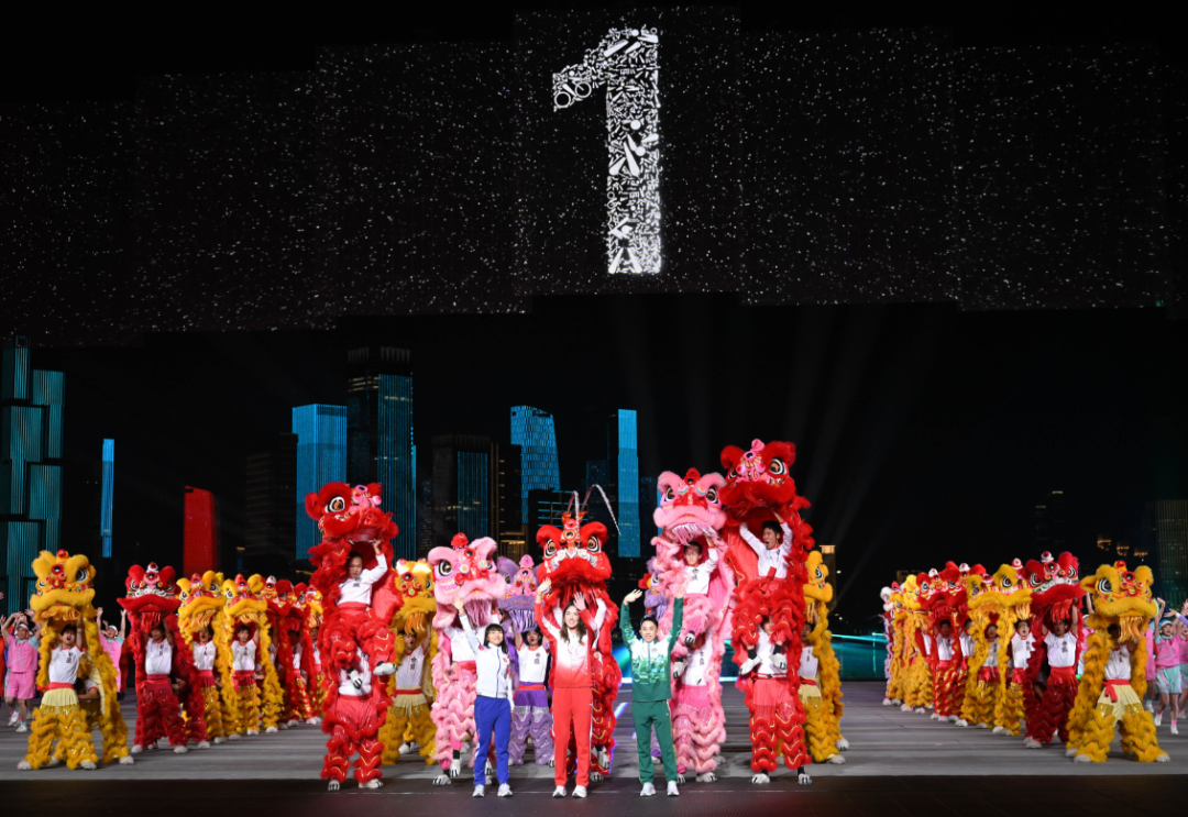 作为岭南文化发源地,宝安在闭幕式上献上多场文化盛宴。刚斩获本届全运会南狮项目首金的福海街道桥头社区醒狮团,150名队员全程参与三大环节,总教练谭展飞表示:“这次我们负责了闭幕式的三个重要环节,可以说贯穿始终。”暖场节目《舞动大湾区》中融合岭南古乐与英歌舞,在仪式环节负责开场;而在展演部分,醒狮更是串联起粤港澳三地5种特色创意项目。