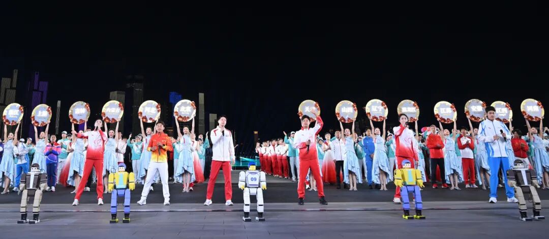 鹿明机器人的AI迷你双足人形机器人“鹿小明”则带来惊喜。5个机器人在《气势如虹》表演中,与马龙、苏炳添等运动员精准配合,完成手臂摆动、转身踏步及平衡站立等高难度动作,其搭载的AI视觉识别系统可实时捕捉音乐节拍,误差控制在0.1秒内,展现宝安智能制造的顶尖水准。