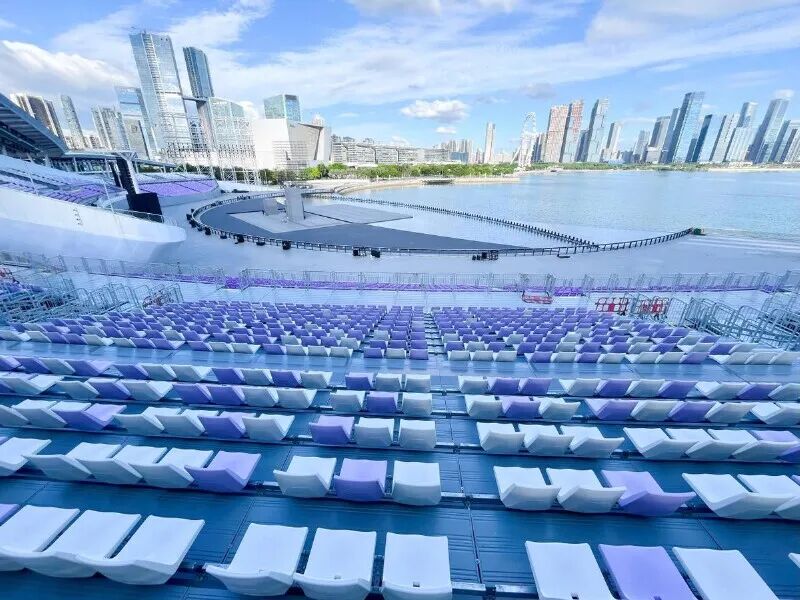 在这场“城市全景闭幕式”中,宝安本土企业的硬核科技成为关键支撑。领先体育无偿提供的5500个“可打包”模块化金属看台,不仅实现48小时快速组装拆卸,更针对欢乐港湾海滨地形特性,通过特殊防腐处理适配潮湿环境,8000个“梦幻紫”座位组成的看台既保障观众安全,又与海景完美融合。