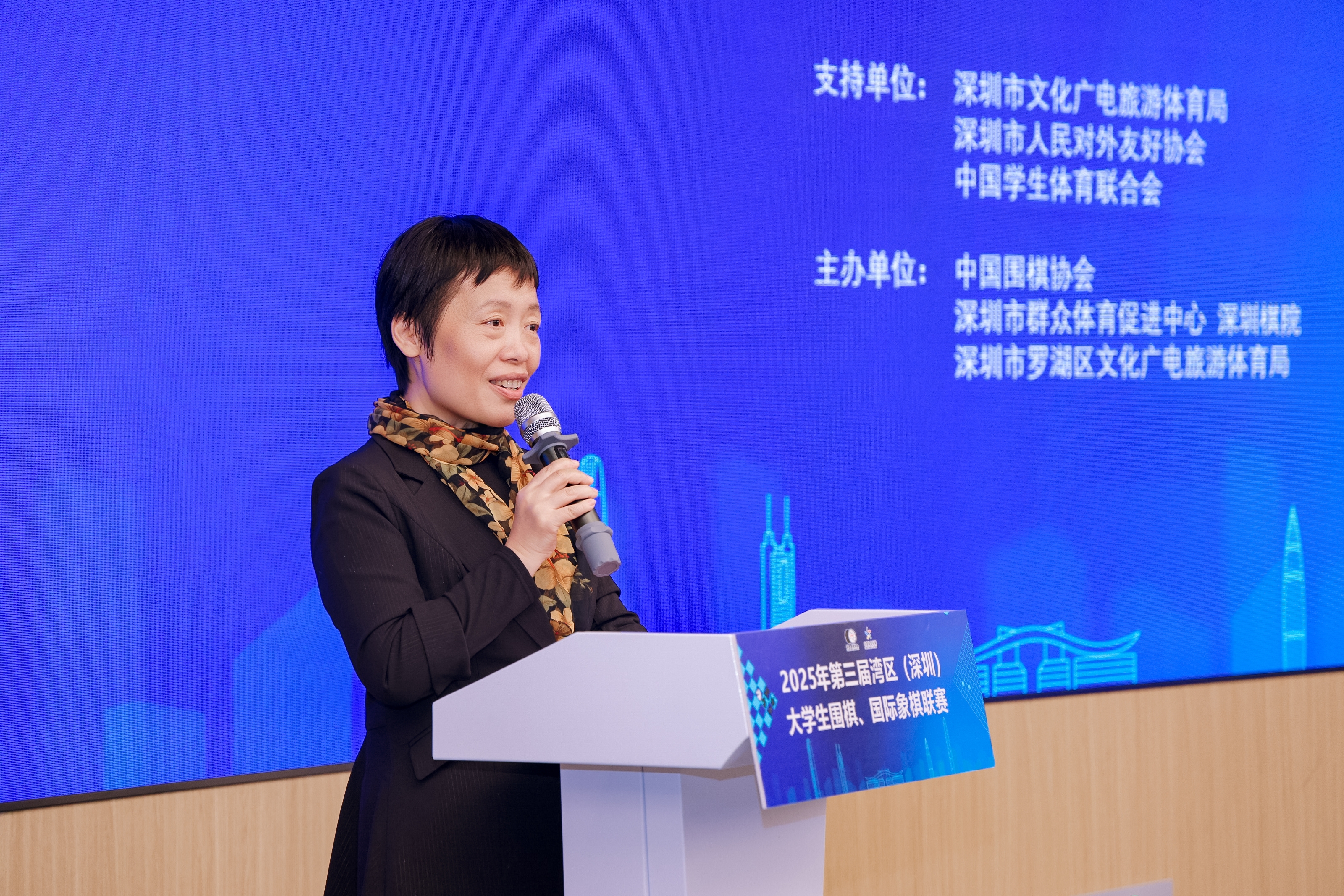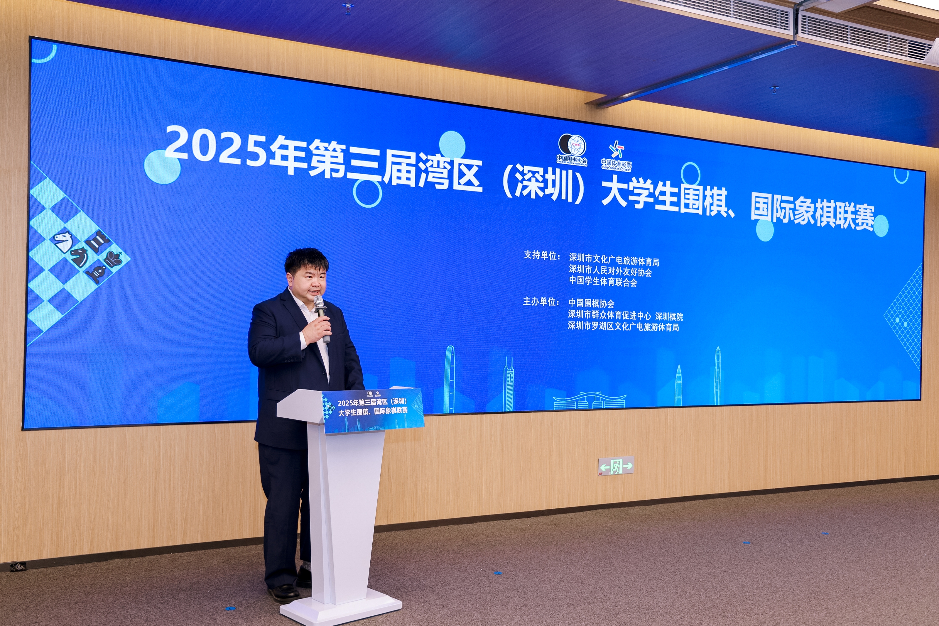 谢军主席在开幕式致辞中表示,棋类运动在今天这个时代,其意义早已超越了竞技本身。围棋的十九路经纬与国际象棋六十四格黑白世界中所蕴含的千变万化,考验的不仅是计算与谋略,更是意志的磨砺、心态的修炼与品格的塑造。粤港澳大湾区,是国家改革开放的前沿阵地,是连接中国与世界的重要枢纽。今年9月、10月,十五运棋牌类项目在这里举行。在这里举办大学生棋类联赛,具有非同寻常的象征意义。张蔚部长致辞表示,本届赛事不仅是围棋技艺的切磋平台,更是中美围棋文化交流的重要载体。我们以棋为媒,在赛事期间精心策划了"中美围棋交流系列活动",这些活动既是对"中国围棋文化走出去"工作的生动实践,也为深化中美围棋文化交流搭建了新的平台。围棋虽只有黑白二子,却蕴含着"和而不同"、"美美与共"的东方智慧。通过围棋这一共同的语言让不同文化背景的青年学子在方寸棋盘间增进理解、建立互信,为推动文明互鉴、促进民心相通注入独特的"围棋力量"。张文东主任代表本次比赛组委会向各位来自五湖四海的参赛学生们的到来表示热烈欢迎,希望能够通过这一活动,以棋为媒,促进湾区大学生青年交往、交流、交融,加强湾区青年人的紧密联系和共同发展。张文东主任宣布第三届湾区(深圳)大学生围棋联赛、国际象棋联赛开幕。