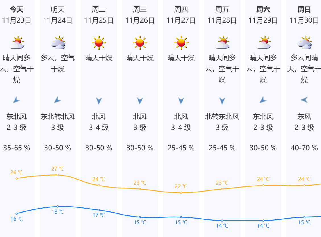 11月23日,深圳晴天间多云,空气干燥;气温16-26℃;东北风2-3级;相对湿度35%-65%。