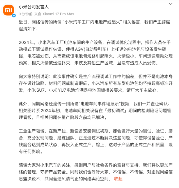 小米方面强调,此次事件确实是生产流程调试工作中的偏差,但并不是电池本身存在设计缺陷、材料问题或制造瑕疵。小米汽车所有车型电池包均坚持超高标准开发,小米SU7、小米YU7电池均满足电池国标相关要求,请广大车主放心。