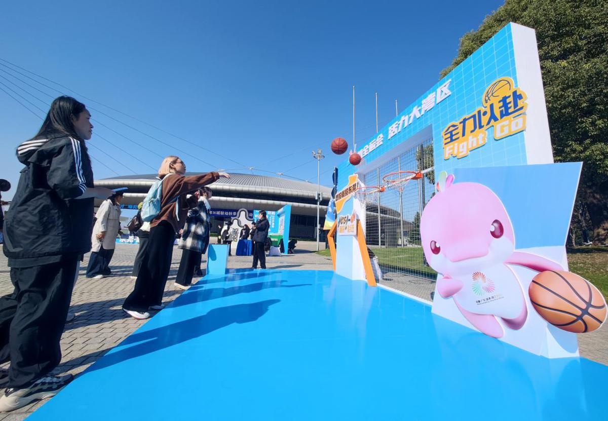11月21日,“百万英才汇南粤”2025年N城联动秋季招聘活动在浙江大学举办。图为活动现场设置的投篮互动和冠军展示区