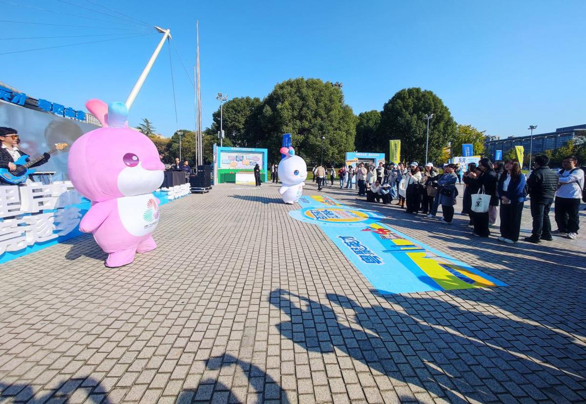 11月21日,“百万英才汇南粤”2025年N城联动秋季招聘活动走进浙江大学。图为十五运吉祥物“喜洋洋”“乐融融”在现场与学子们互动