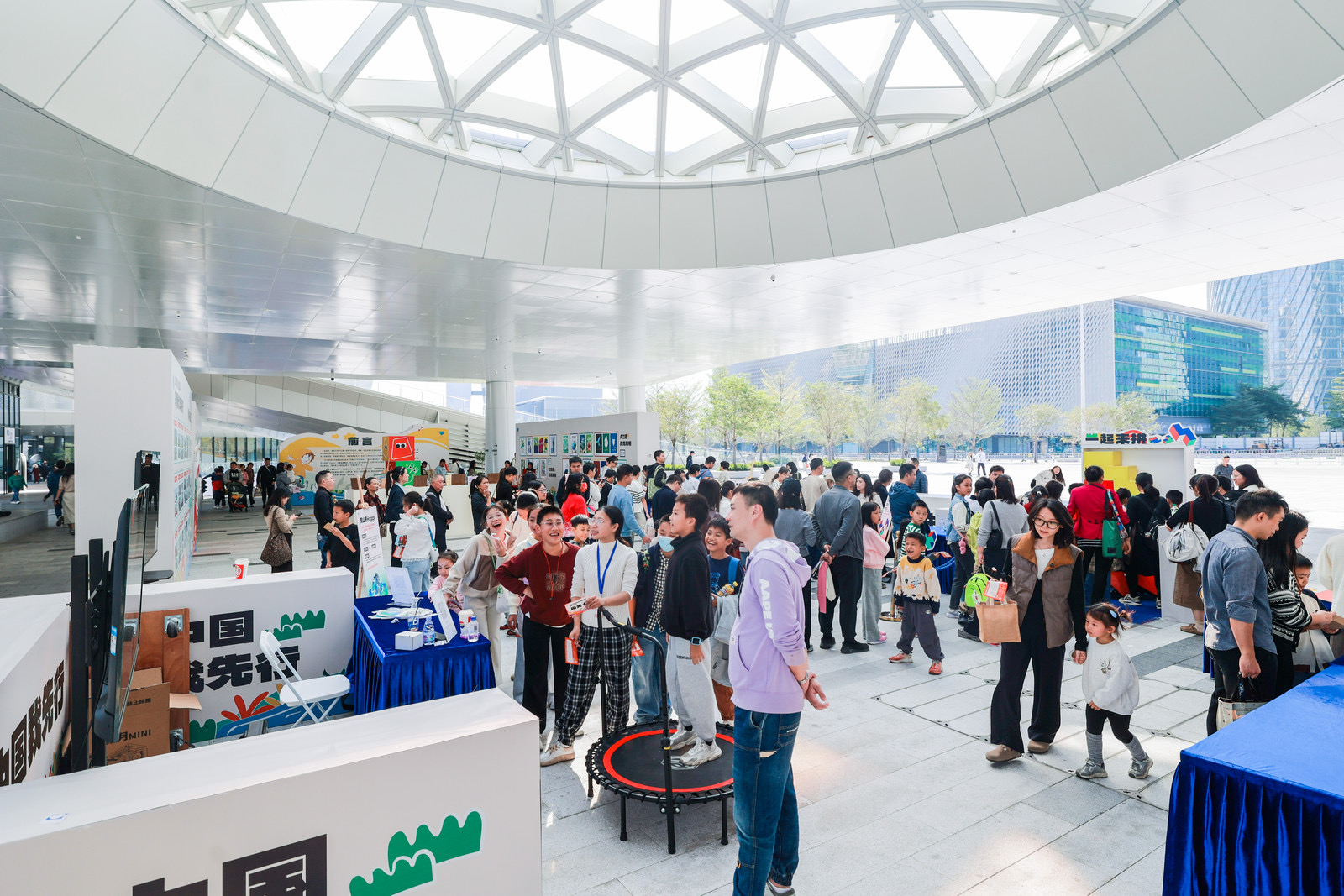 在深圳书城湾区之眼海天连廊上,闻讯而来的上百名青少年儿童正在参加包括“爬山吧Happy”、“落叶拼贴画”等涵盖科技体验、竞技挑战、DIY手工等多种类型的趣味十足生态互动游戏。