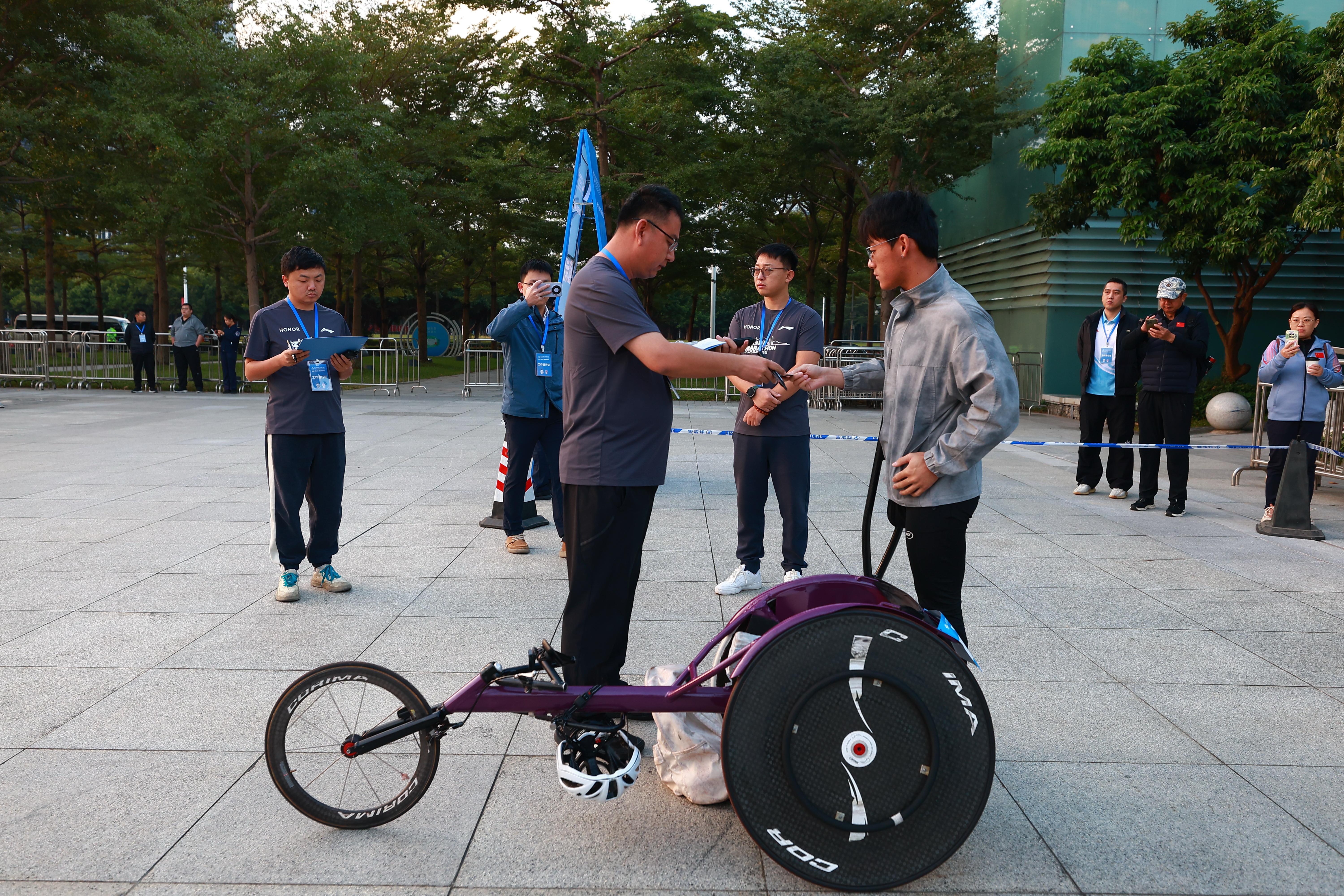 清晨六点,受邀参加测试的竞速轮椅运动员、视障运动员、听障运动员及上肢残疾运动员,在入住酒店经工作人员引导有序完成报到,统一搭乘接驳车前往起点——深圳市民广场。抵达现场后,起点工作人员迅速开展证件核验、陪跑绳及辅具外观初检工作,同步进行异常情况拦截、放行确认等流程的实战测试。同时,针对轮椅运动员在上下客点、热身区及比赛场地的通行路径,工作人员细致排查台阶、狭窄转弯等潜在障碍,高效完成赛前各项环节的校验。
