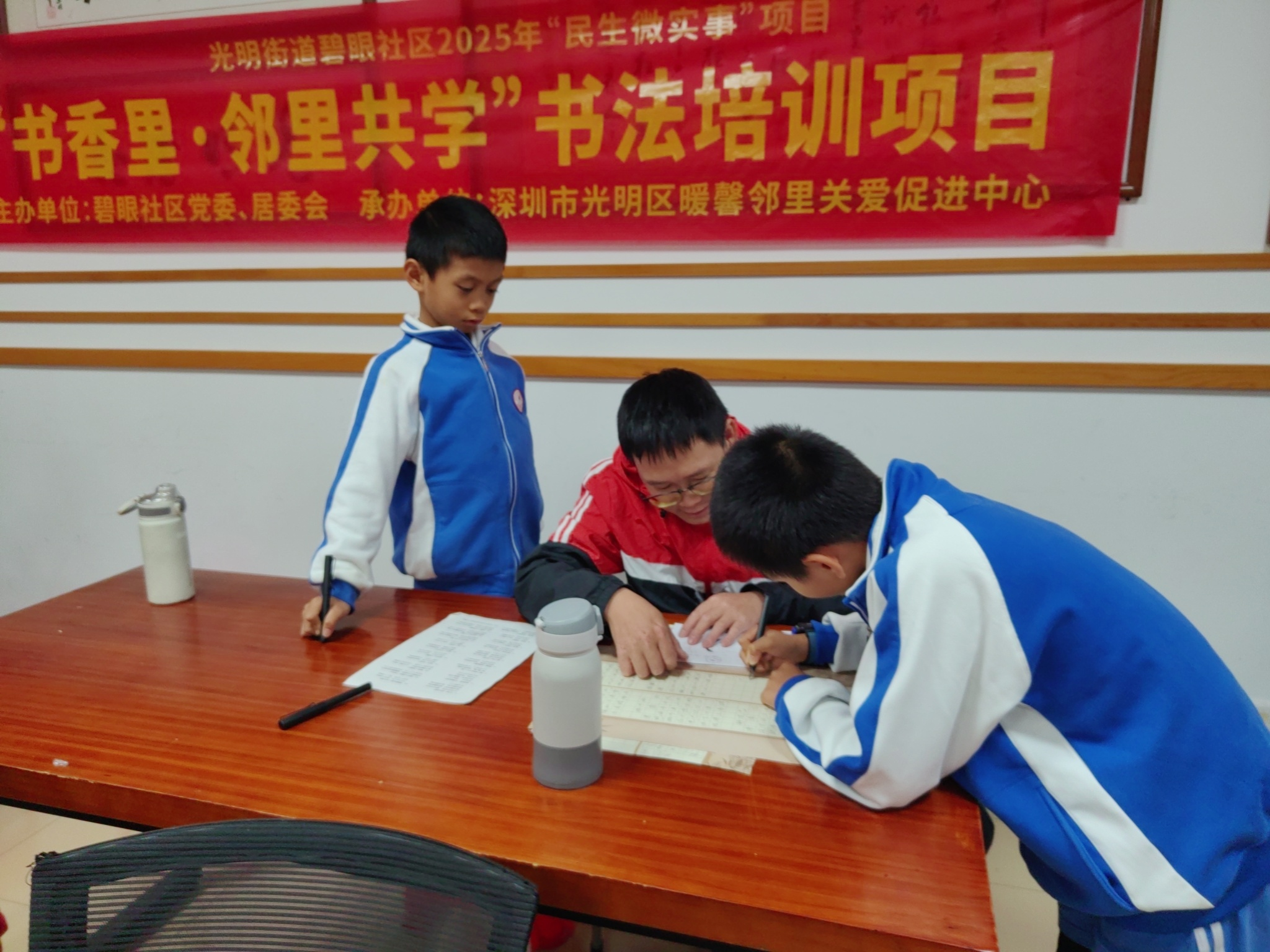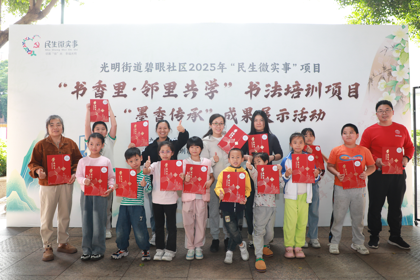 近日,光明街道碧眼社区2025年“民生微实事”——“书香里・邻里共学”书法培训项目圆满落幕,“墨香传承”主题成果展同步举办。项目精准对接社区青少年文化需求,既推动中华优秀传统文化落地传承,又丰富社区文化服务供给,收获居民广泛好评。