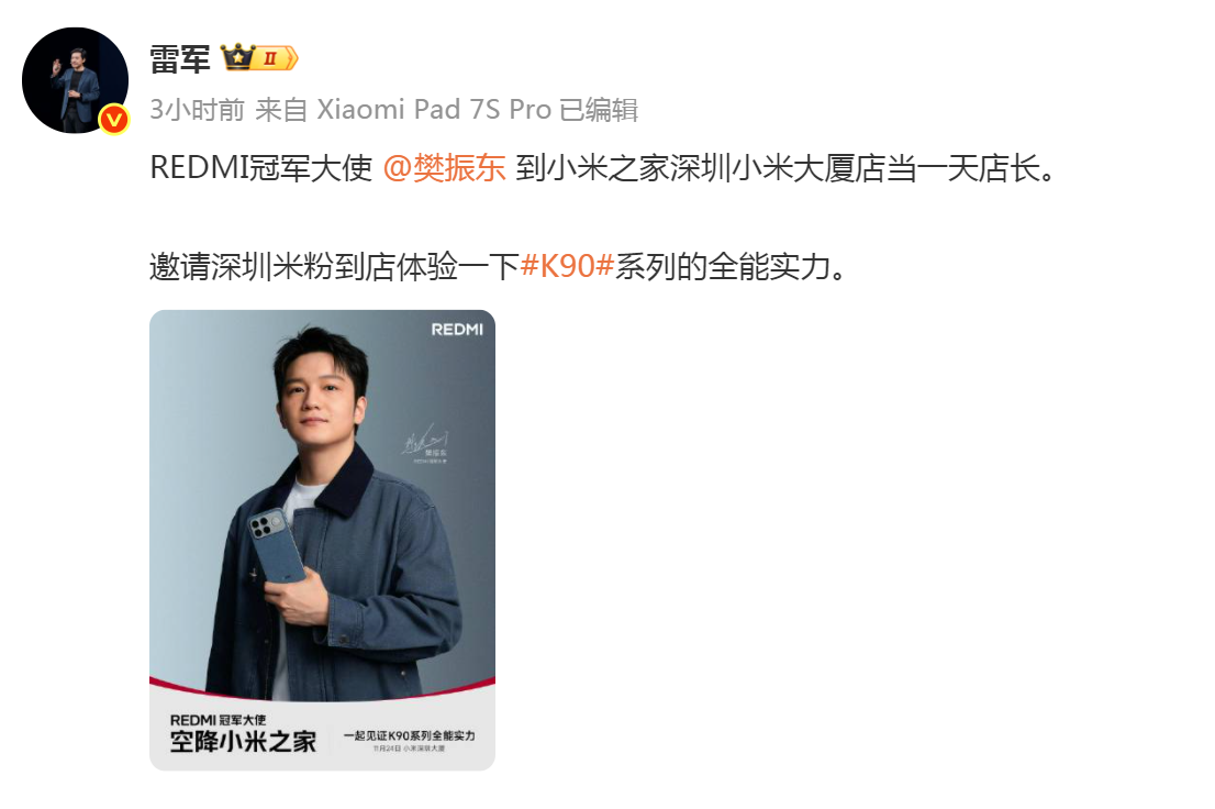 据悉,小米之家深圳大厦旗舰店提前布置冠军主题氛围,店内设置乒乓球元素互动区。樊振东现场跟米粉进行交流,演示K90系列性能,并为购买用户签名。