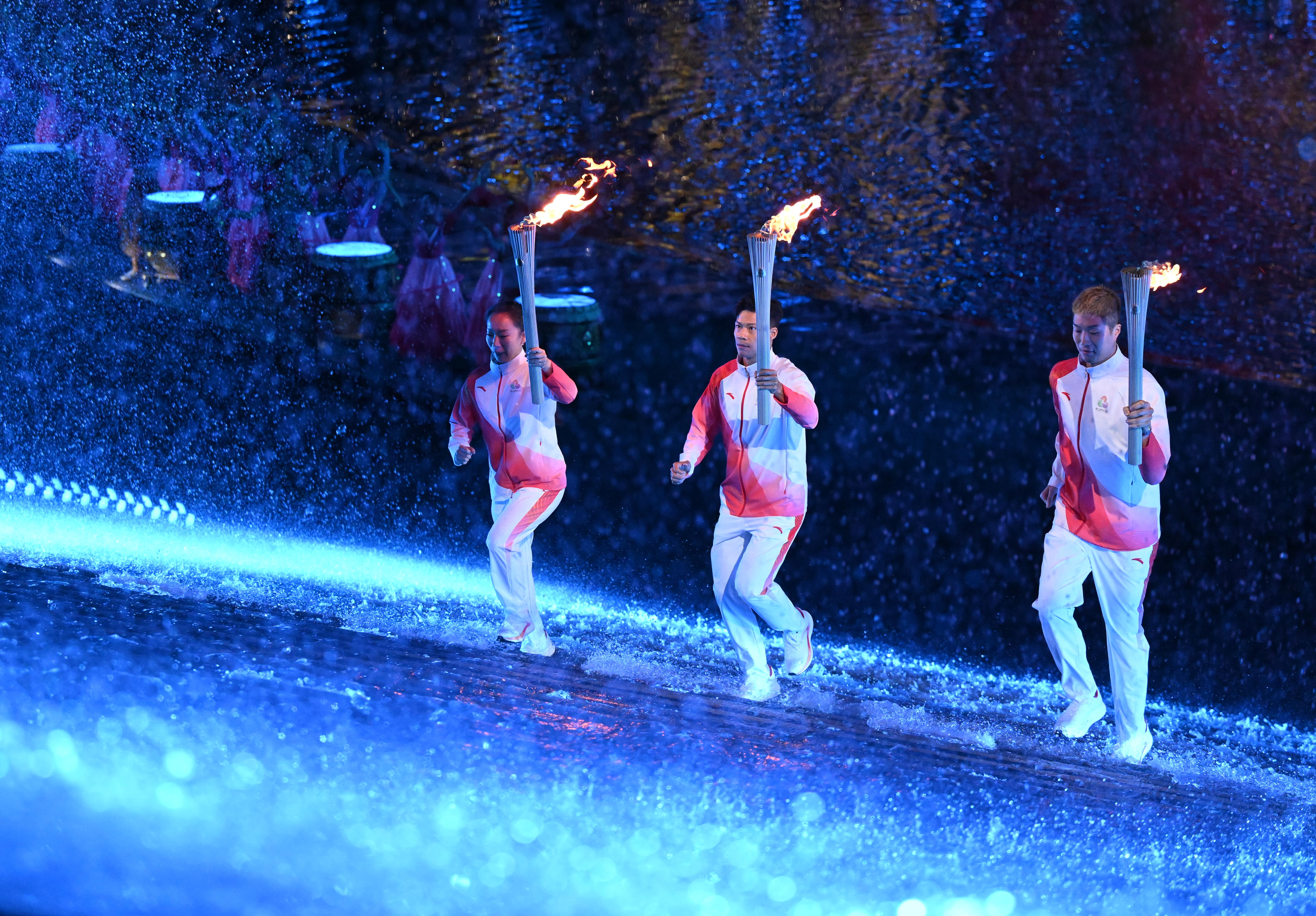 11月9日,在十五运会开幕式上,作为东道主的粤港澳三地运动员并肩入场。《海阔天空》《中国人》等熟悉的旋律响起,万人合唱的歌声回荡在广东省奥林匹克体育场。随后,三位来自不同地区的运动员共同点燃主火炬,见证了大湾区携手共进的信念。