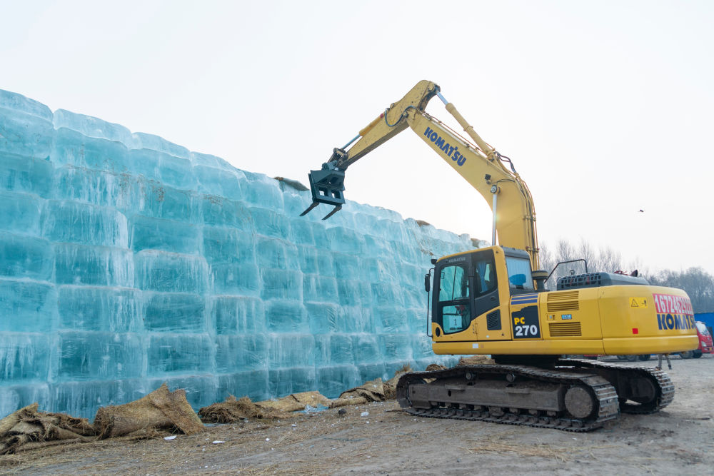 存冰场内,更多的“冰山”露出真容。工人们驾驶着吊车、铲车、叉车等各类车辆在冰垛间穿梭,在紧张而有序的接力配合中,冰垛上的冰块被一块块取下。各类大型机械动作利落又灵巧,让极为脆弱的冰块也能最大限度保持完整,为后续冰雪大世界的建设做好充分准备。