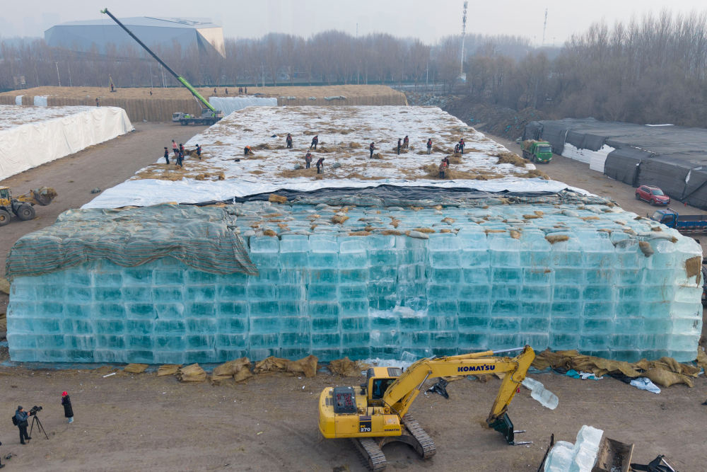 11月24日,在哈尔滨冰雪大世界存冰场,覆盖在“冰山”上的“厚棉被”被层层揭开。取冰工人驾驶着叉车,将叉车臂灵巧地伸进厚厚的冰块中间,将冰块托起放到卡车上——这是今年取出的第一块存冰。