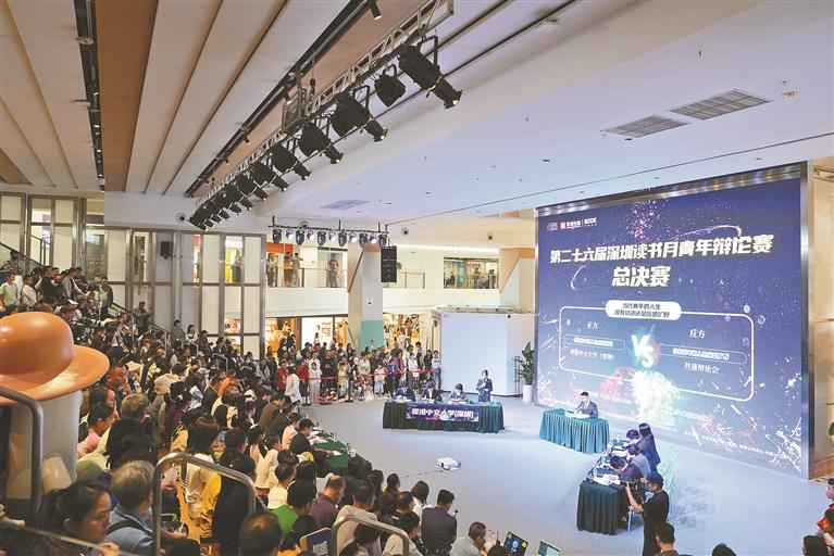 11月23日下午,第二十六届深圳读书月青年辩论赛总决赛在深圳中心书城北区台阶举行,由香港中文大学(深圳)辩论队与菖蒲辩论会同台对垒。